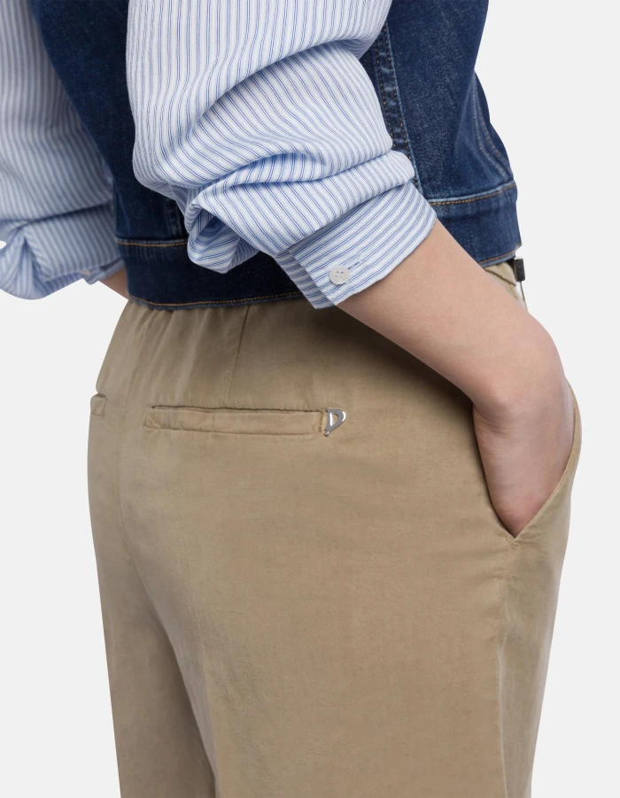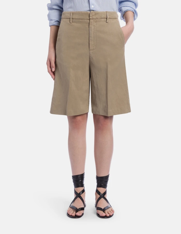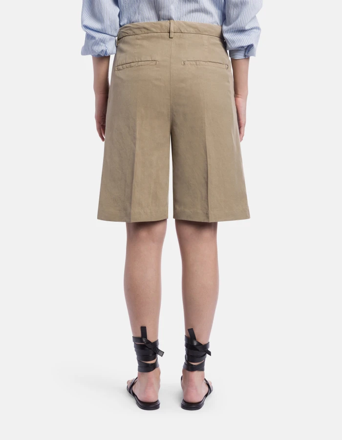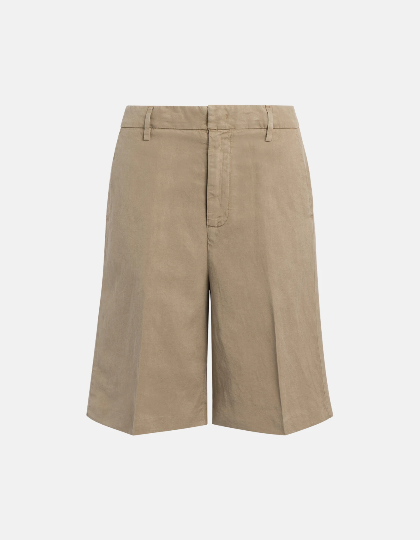 Bermuda Nita regular fit, vita alta, tasche a filetto posteriori. Lino e lyocell. Tintura in capo. Logo Dondup. Made in Italy