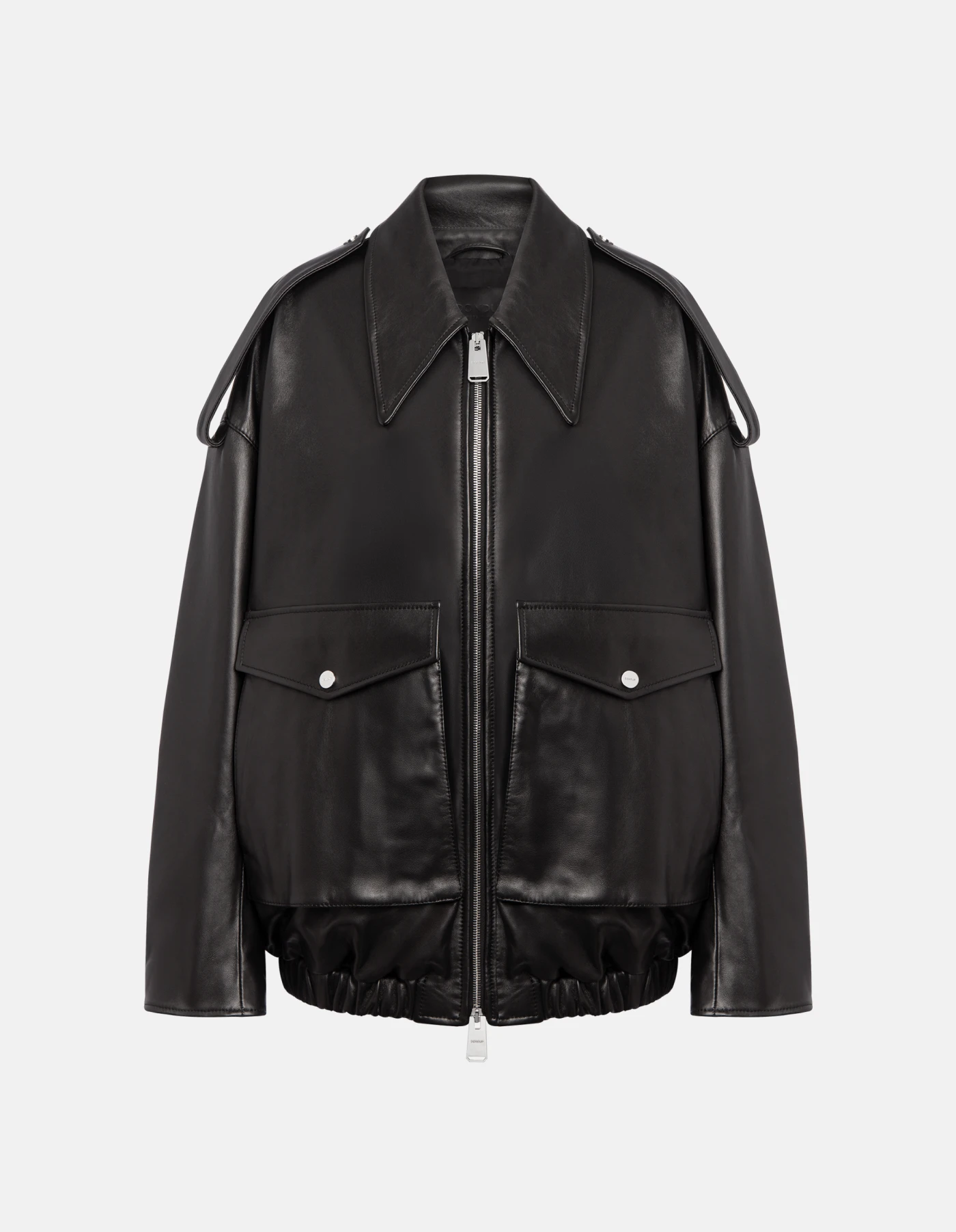 Bomber over con collo a camicia, allacciatura con zip metallica ed elatico sul fondo. Alamari su spalle, tasche con soffietto e pattine a punta. Nappa. Logo Dondup. Made in Italy