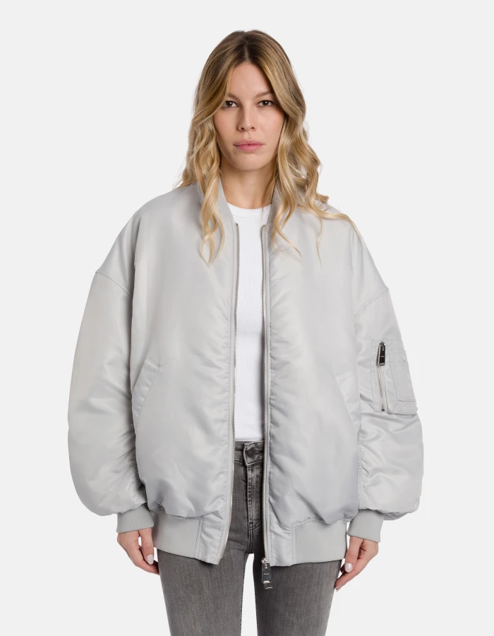 Bomber over con collo, fondo e polsi in maglia, allacciatura con zip metallica e taschino su manica destra. Imbottitura con ovattina leggera. Nylon antigoccia. Logo Dondup. Made in Italy