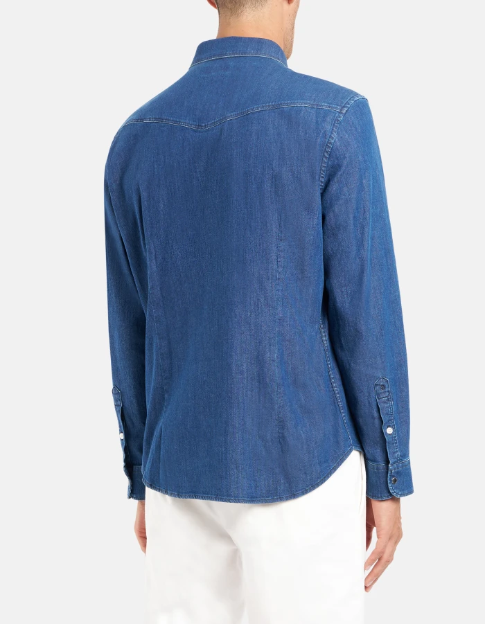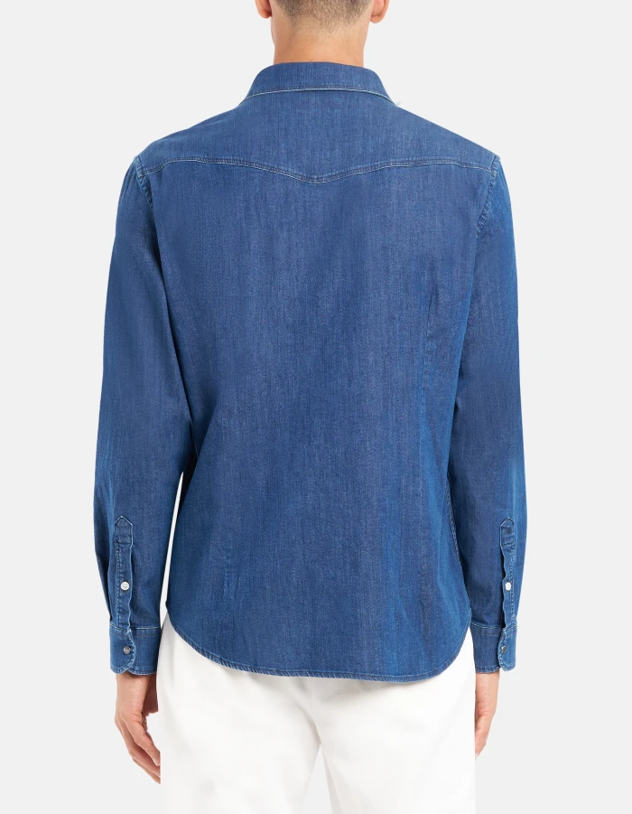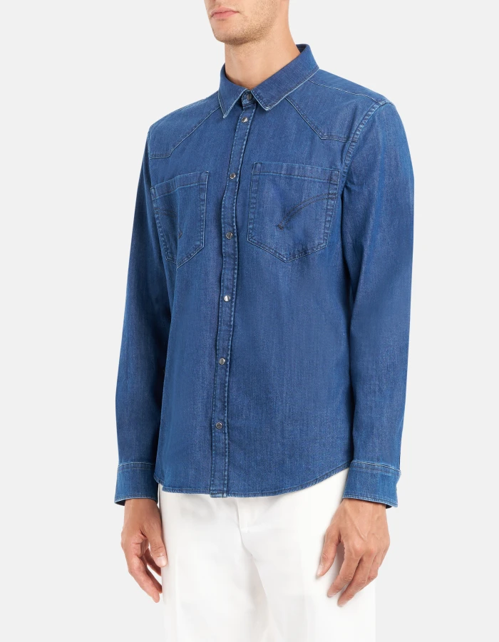 Camicia slim a maniche lunghe con tasche impunturate applicate sul davanti e chiusura con bottoni a pressione. Denim stretch leggero blu 6 oz. Lavaggio scuro pulito. Logo Dondup. Made in Italy