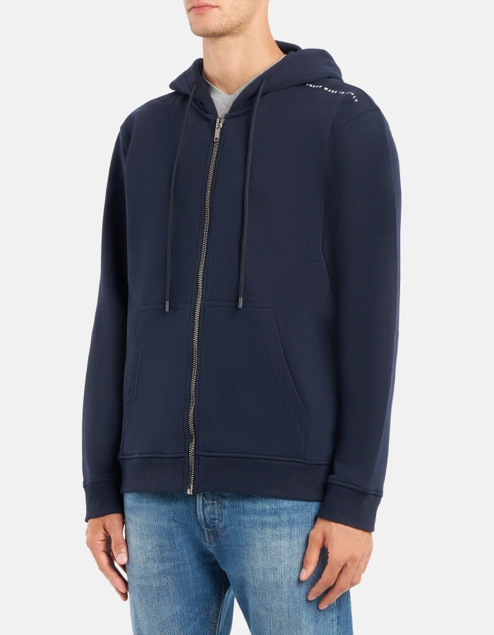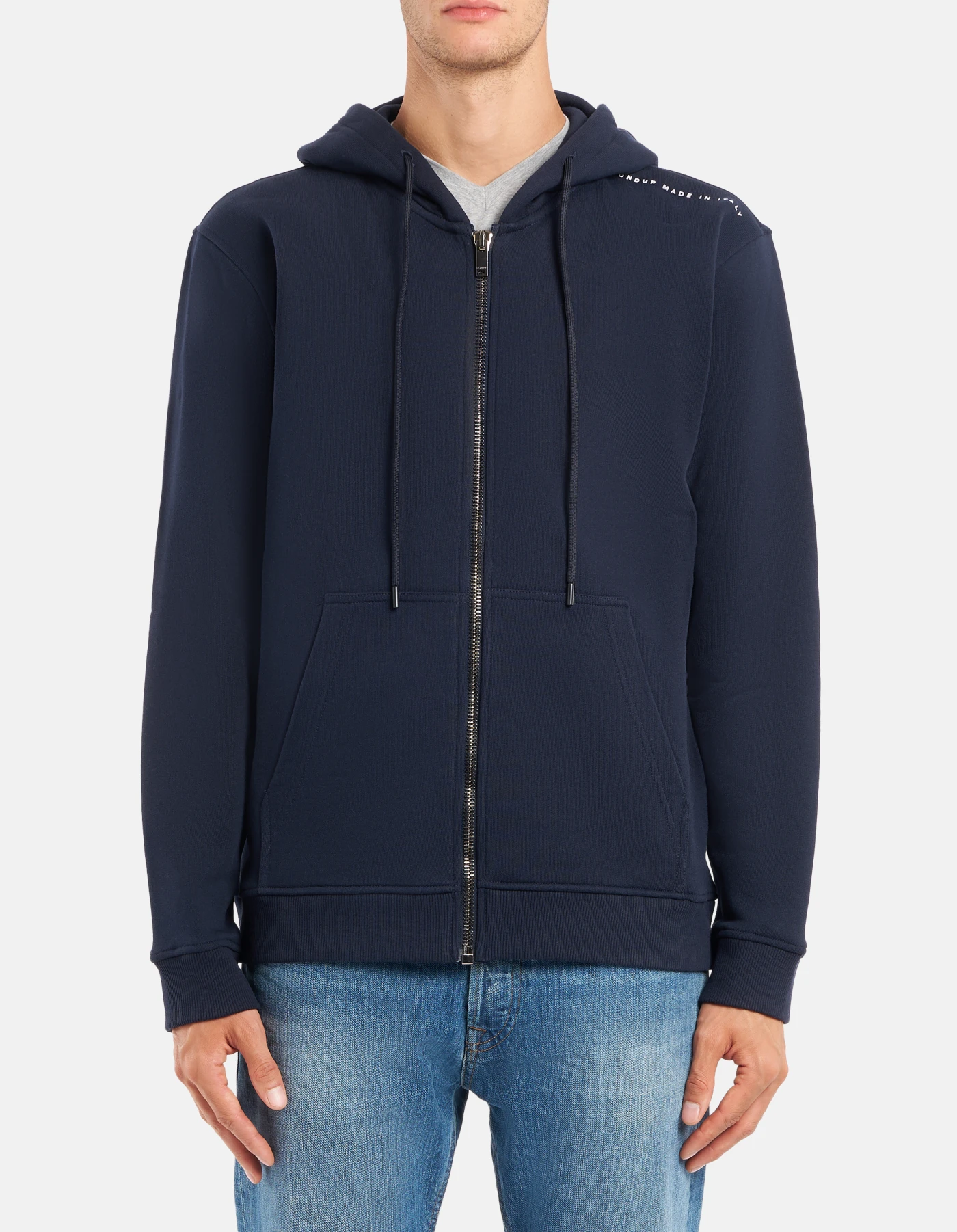 Felpa con cappuccio regular a maniche lunghe con tasca a marsupio, chiusura con zip e stampa logo sulla spalla sinistra. Felpa di cotone. Logo Dondup. Made in Italy