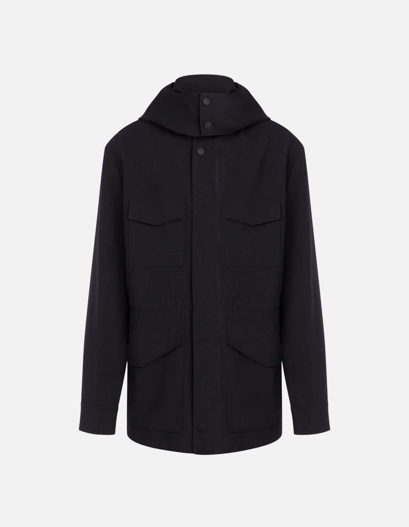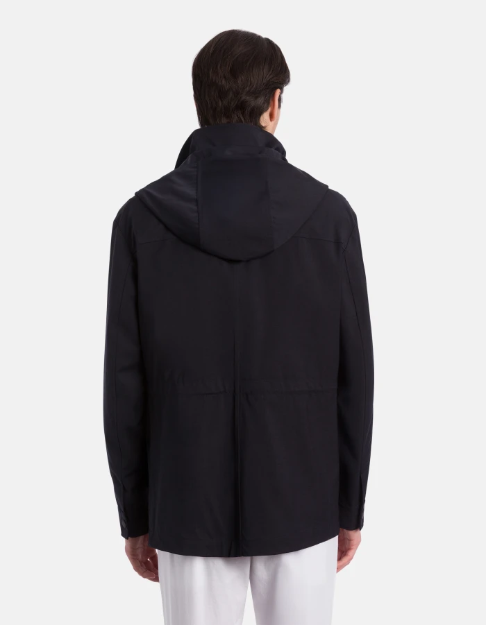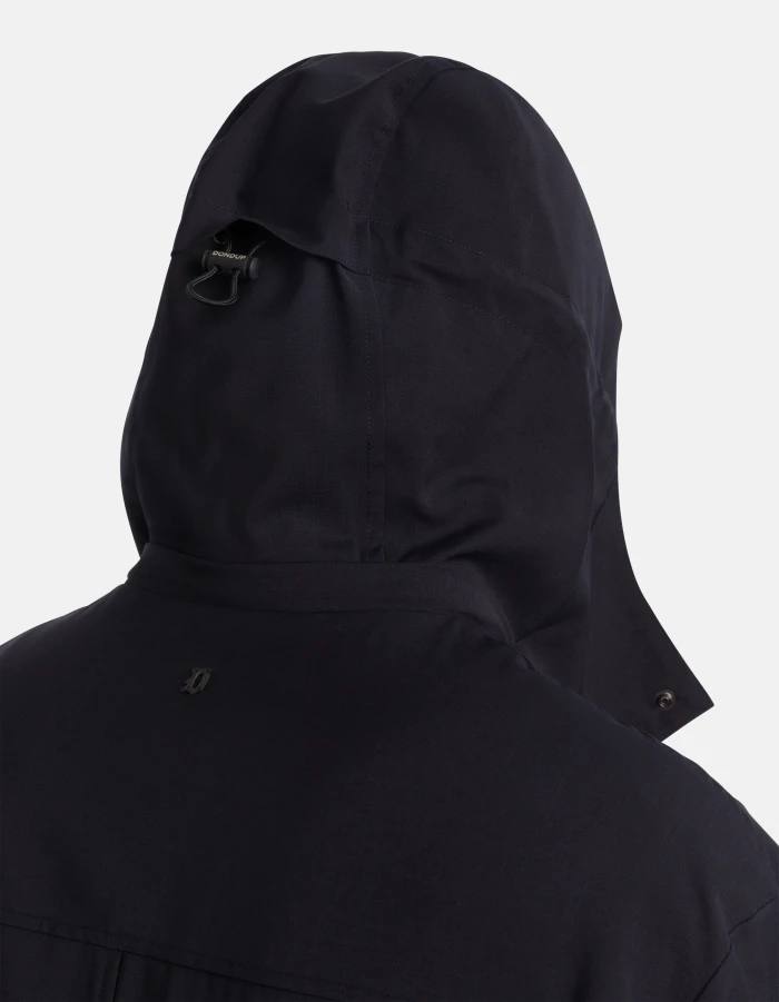 Field jacket regular foderata in mesh con cappuccio, allacciatura con zip e bottoni a pressione nascosti e quattro tasche a toppa con patta a punta. Lana tecnica stretch. Logo Dondup. Made in Italy