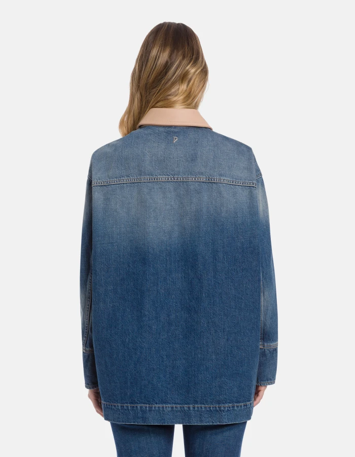 Giacca over con quattro tasche a toppa e collo a camicia in pelle lavabile. Denim fisso sale pepe blu 13 oz. Lavaggio chiaro pulito con tasca in contrasto. Logo Dondup. Made in Italy