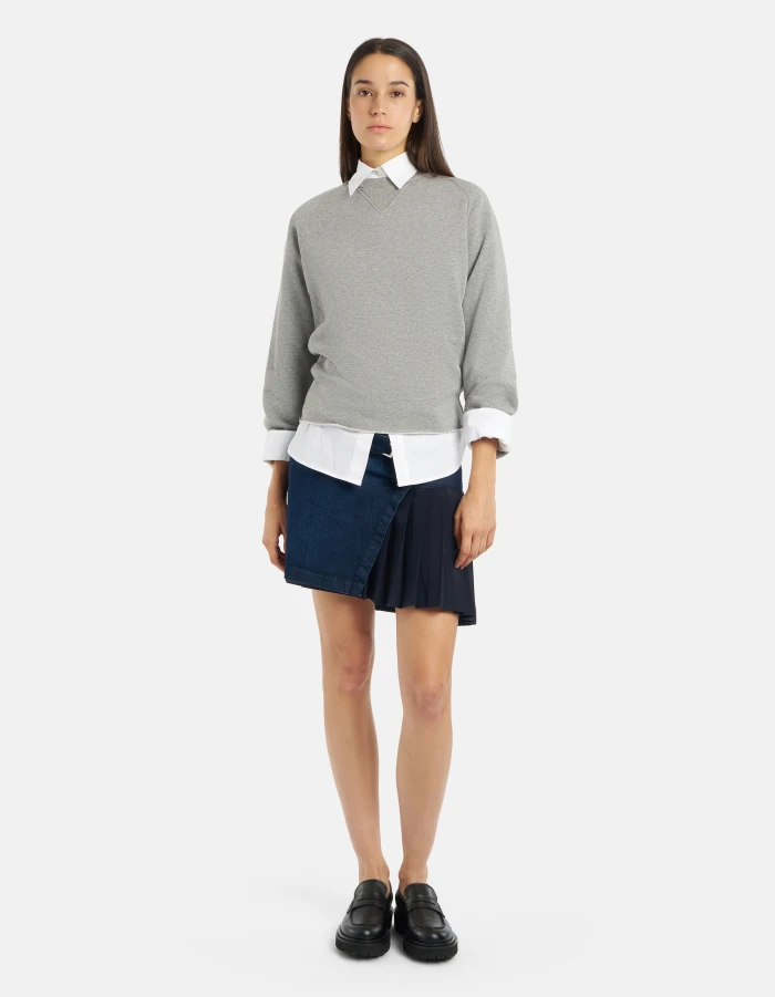 Gonna mini con pannello plissettato in lana, allacciatura a portafoglio con bottoni a pressione nascosti. Denim e tela di lana bistretch. Logo Dondup. Made in Italy