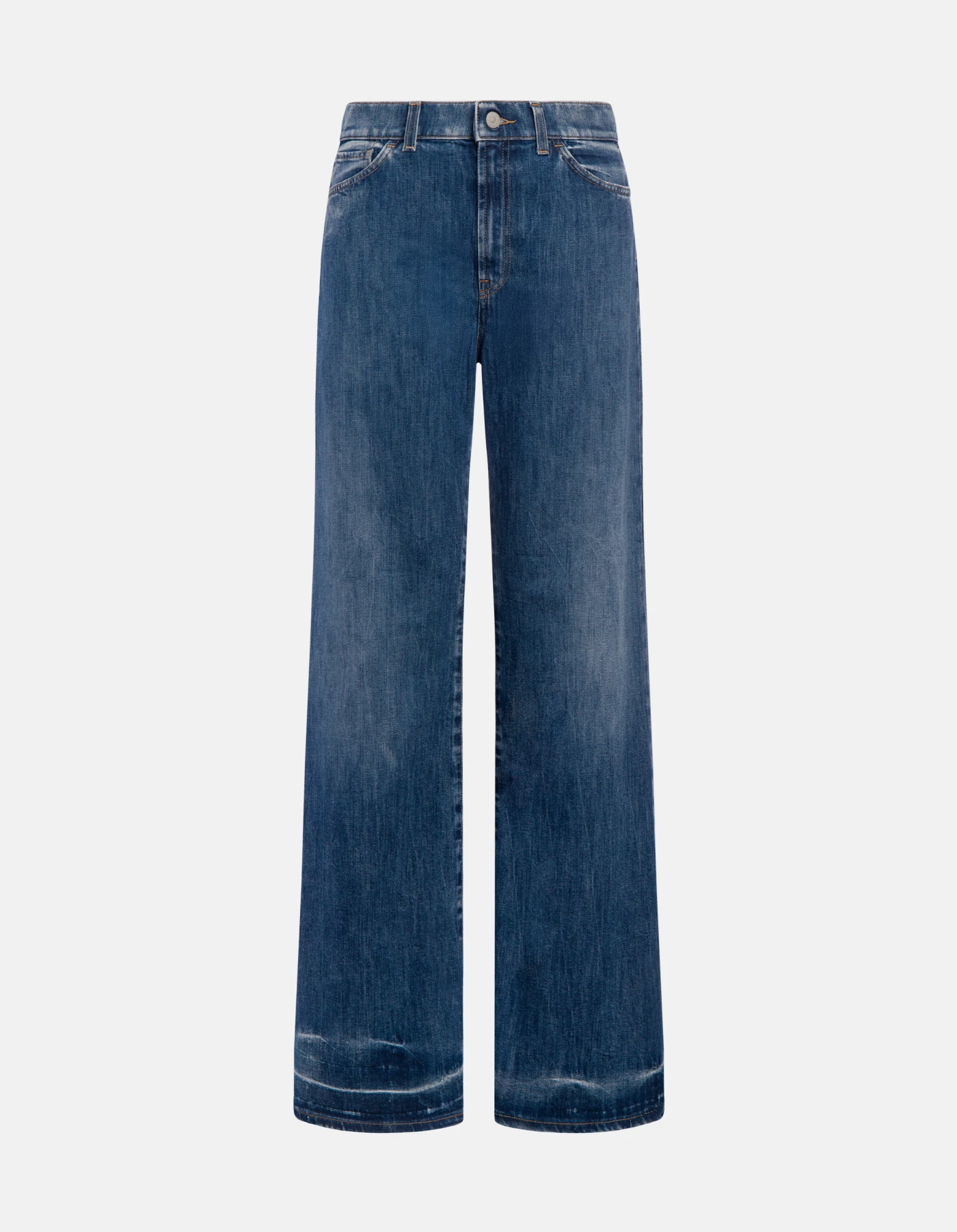 Jeans Amber cinque tasche wide leg fit, vita regolare, gamba ampia. Denim stretch blu 11 oz. Lavaggio vintage medio scuro pulito. Logo Dondup. Made in Italy
