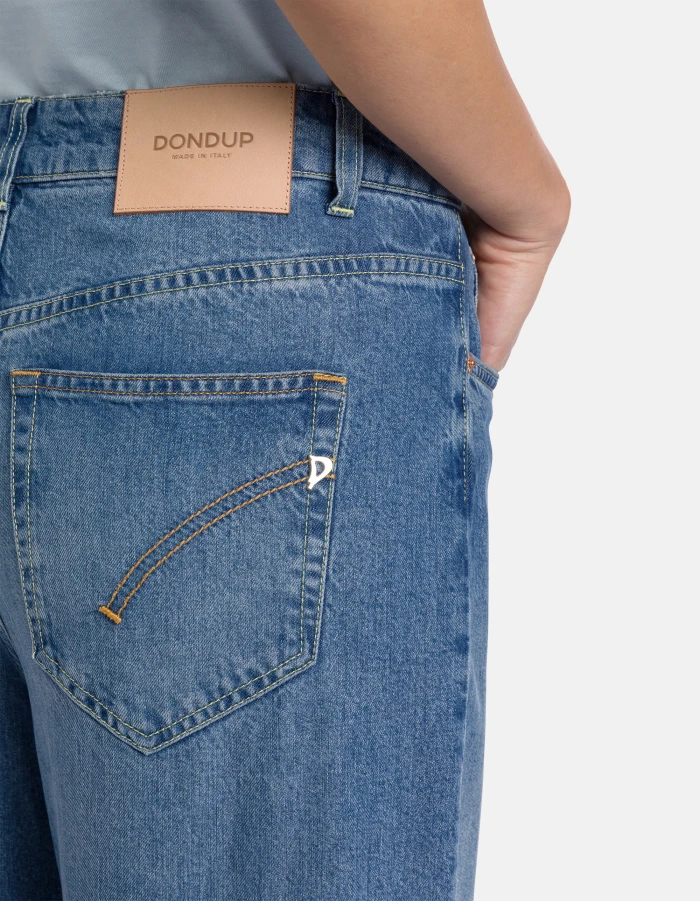Jeans Beatrix cinque tasche wide leg fit, vita regolare e gamba a palazzo. Denim fisso lyocell blu 9 oz. Lavaggio medio chiaro pulito. Logo Dondup. Made in Italy