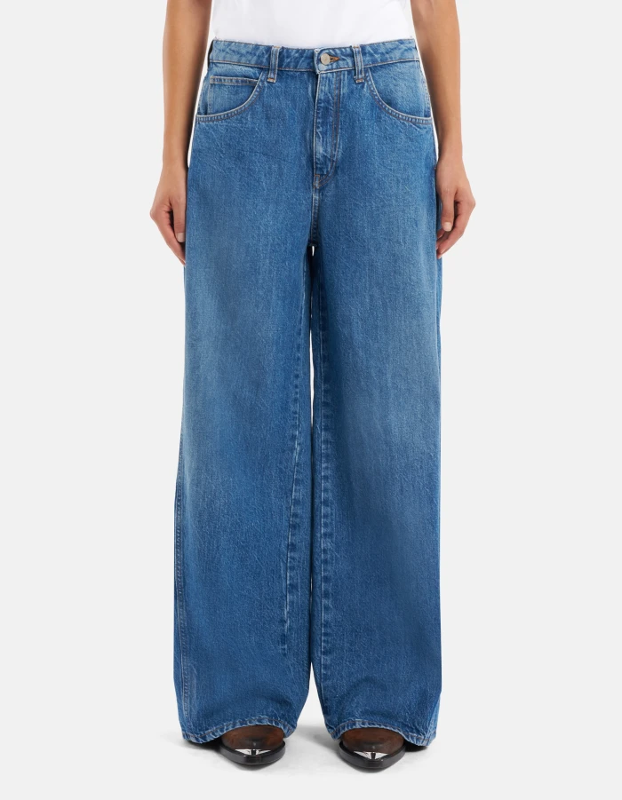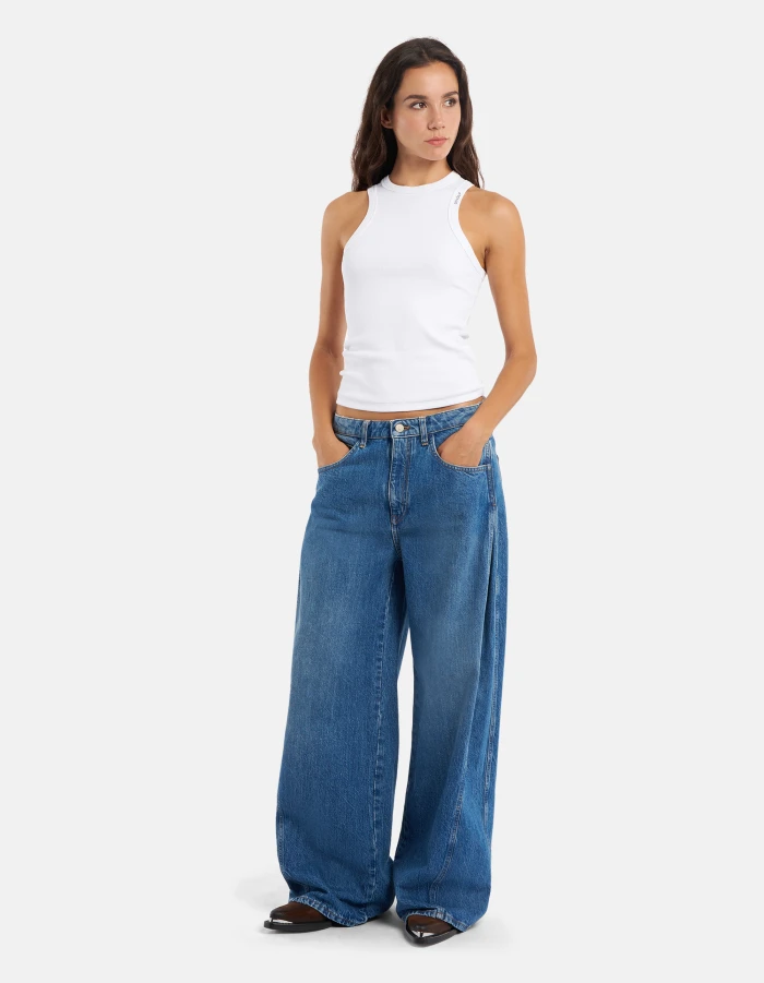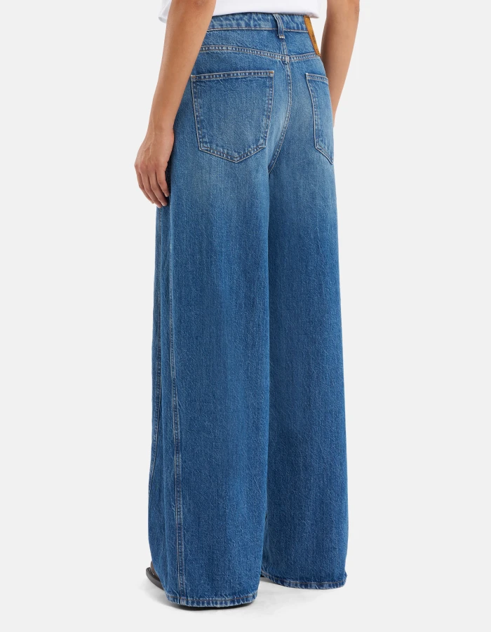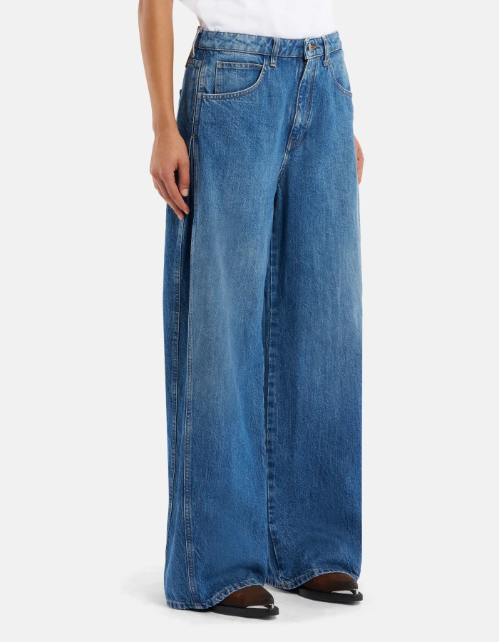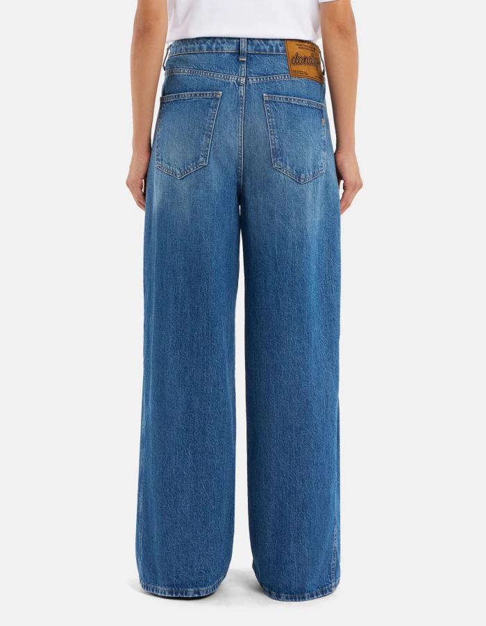 Jeans cinque tasche wide leg fit, vita bassa, gamba ampia e piega sui fianchi. Denim fisso blu 12.50 oz. Lavaggio medio pulito. Logo Dondup. Made in Italy