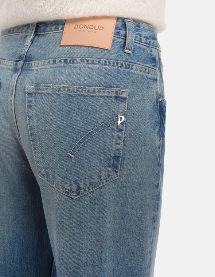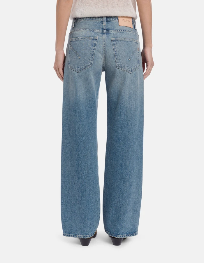 Jeans Jacklyn cinque tasche wide leg fit, vita bassa, gamba a palazzo. Denim fisso sale pepe blu 13 oz. Lavaggio vintage chiaro con rotture. Logo Dondup. Made in Italy