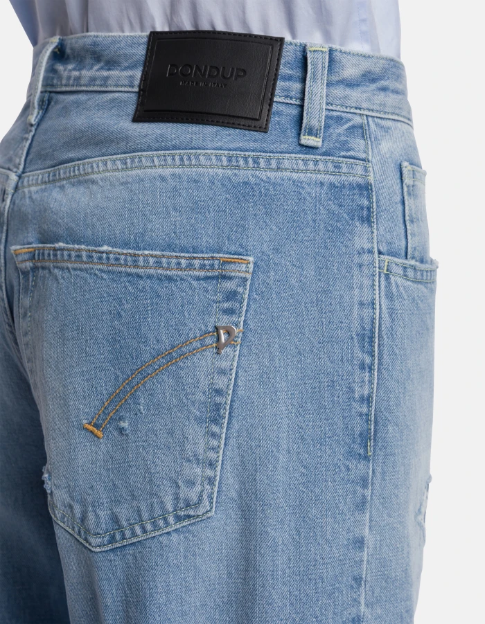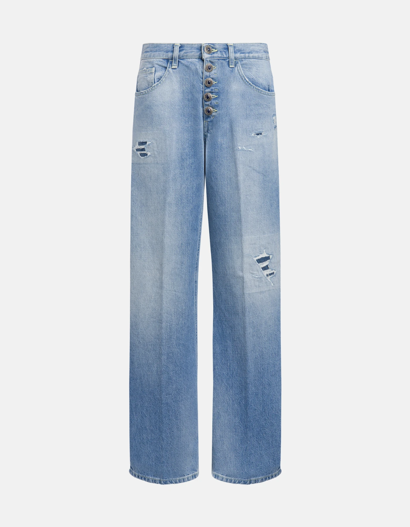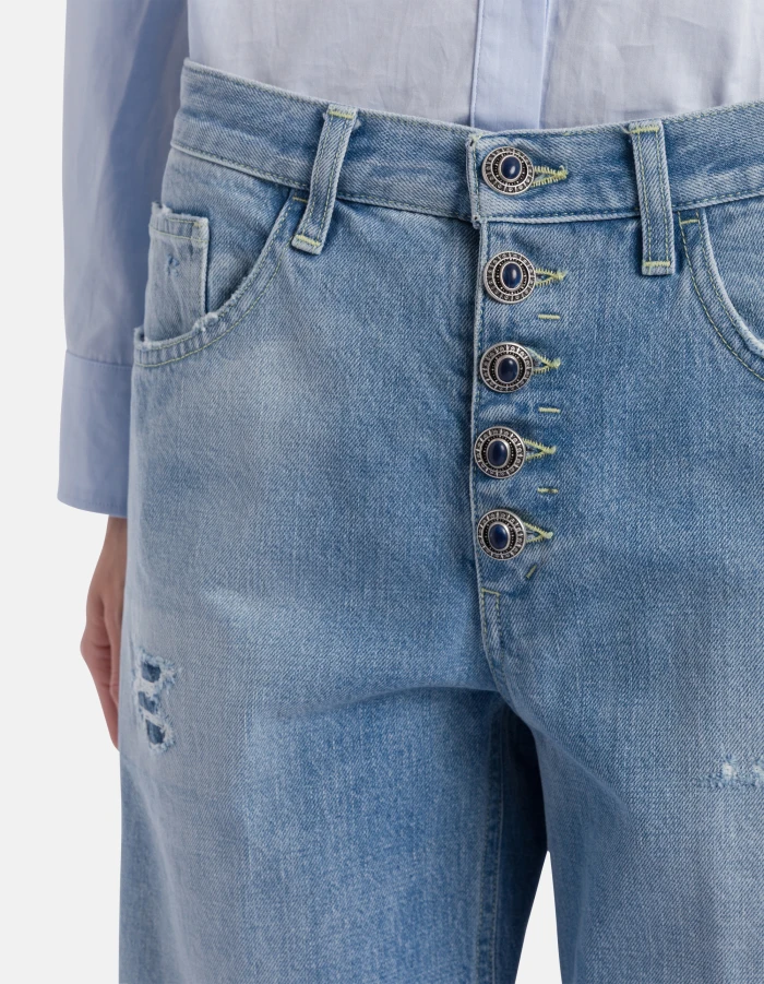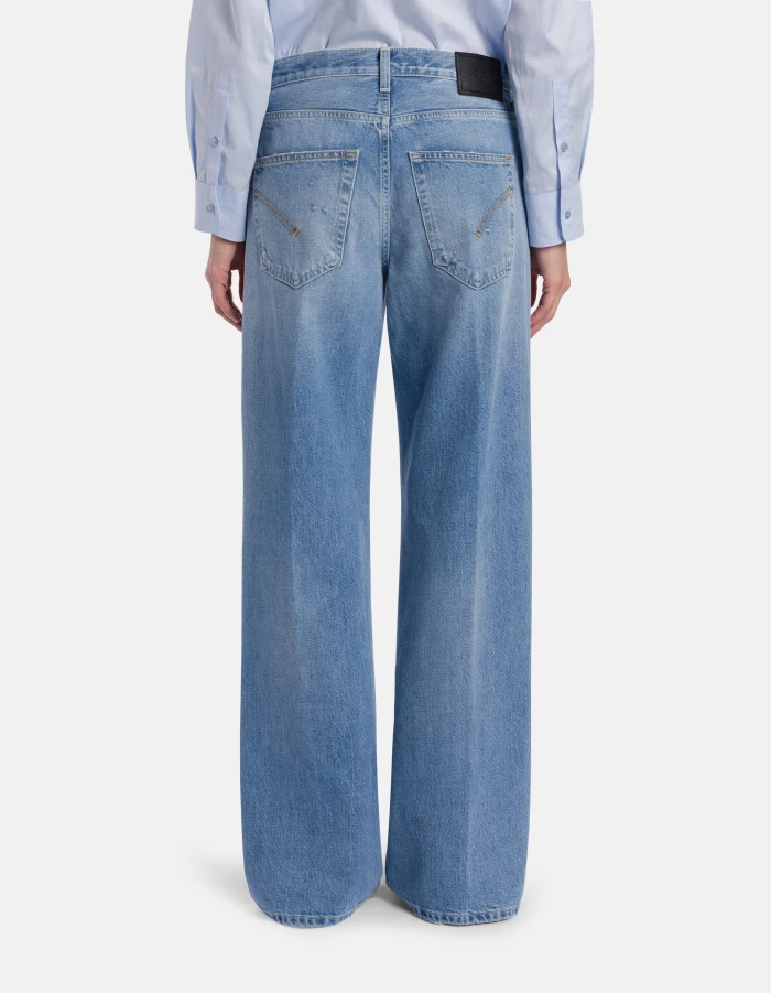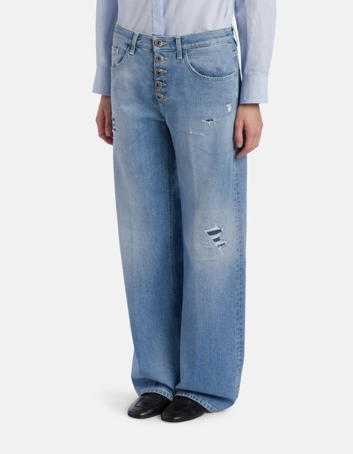 Jeans Jacklyn cinque tasche wide leg fit, vita bassa, gamba a palazzo, bottoniera gioiello. Denim fisso sale pepe blu 13 oz. Lavaggio chiaro con rammendi. Logo Dondup. Made in Italy