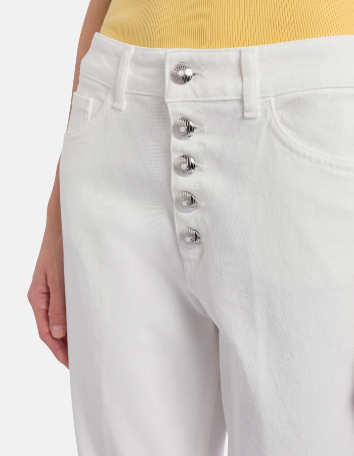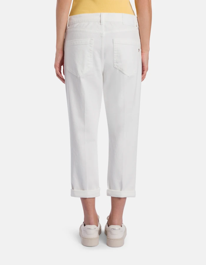 Jeans Koons cinque tasche loose fit, vita regolare, bottoniera gioiello, lunghezza alla caviglia. Bull stretch bluesign APPROVED 11 1/2 oz. Tintura in capo bluesign. Logo Dondup. Made in Italy