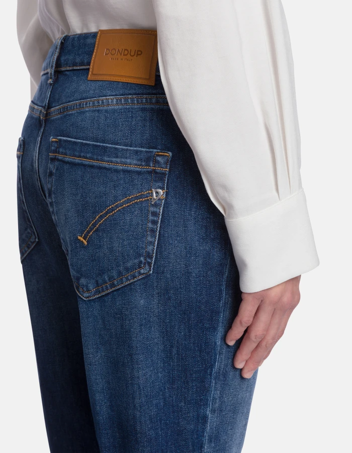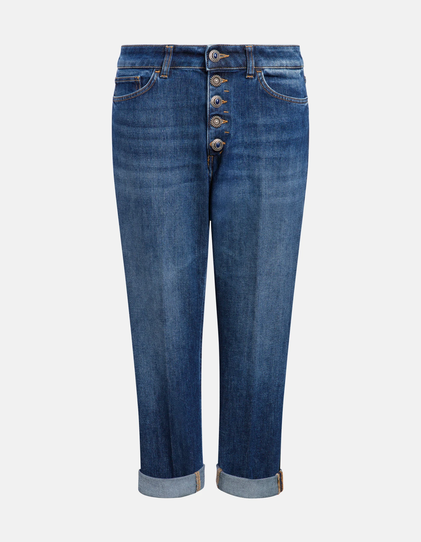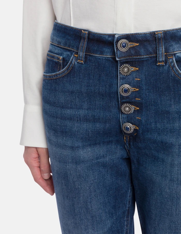 Jeans Koons cinque tasche loose fit, vita regolare, bottoniera gioiello, lunghezza alla caviglia. Denim stretch bluesign APPROVED blu 11.50 oz. Lavaggio medio pulito. Logo Dondup. Made in Italy