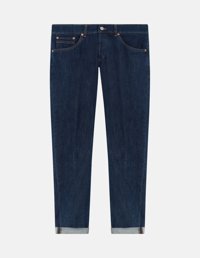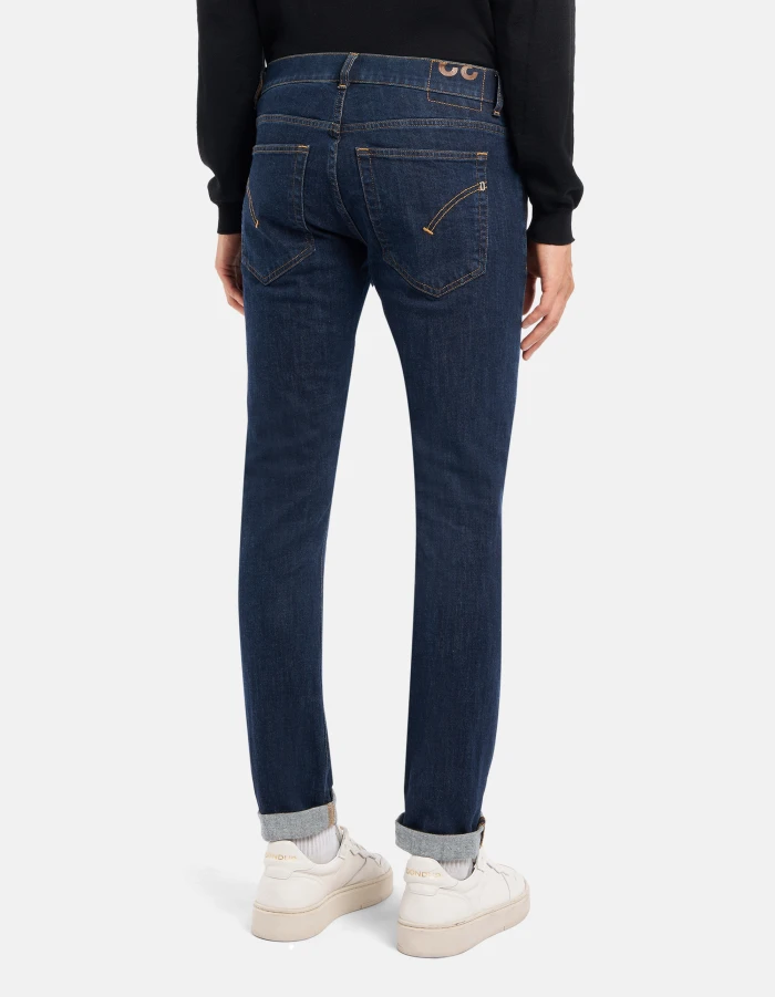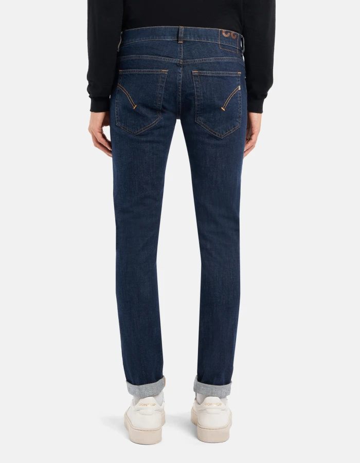 Jeans Ritchie cinque tasche skinny fit, vita bassa. Denim stretch blu 11 1/2 oz. Lavaggio scuro pulito. Logo Dondup. Made in Italy