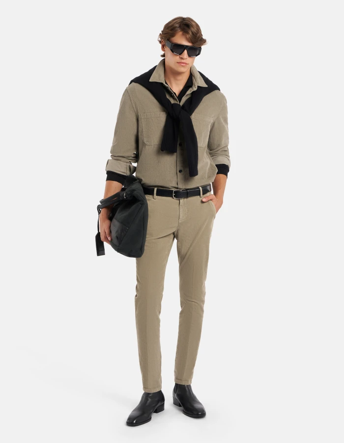 Pantaloni Gaubert slim chino, vita bassa, tasche a filetto posteriori. Velluto a coste 1500 righe. Tintura in capo. Logo Dondup. Made in Italy
