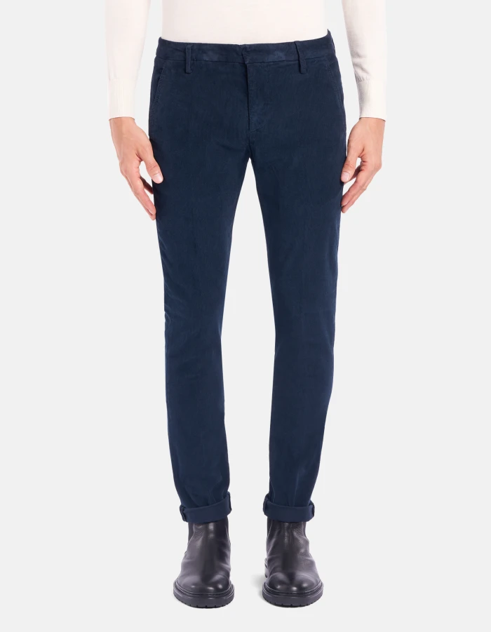 Pantaloni Gaubert slim chino, vita bassa, tasche a filetto posteriori. Velluto a coste 1500 righe. Tintura in capo. Logo Dondup. Made in Italy