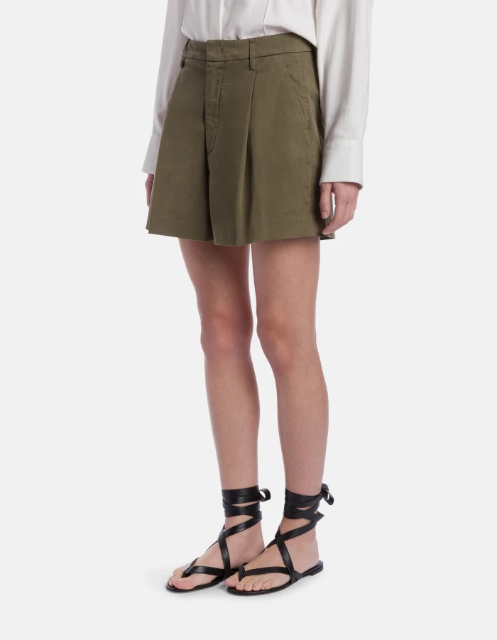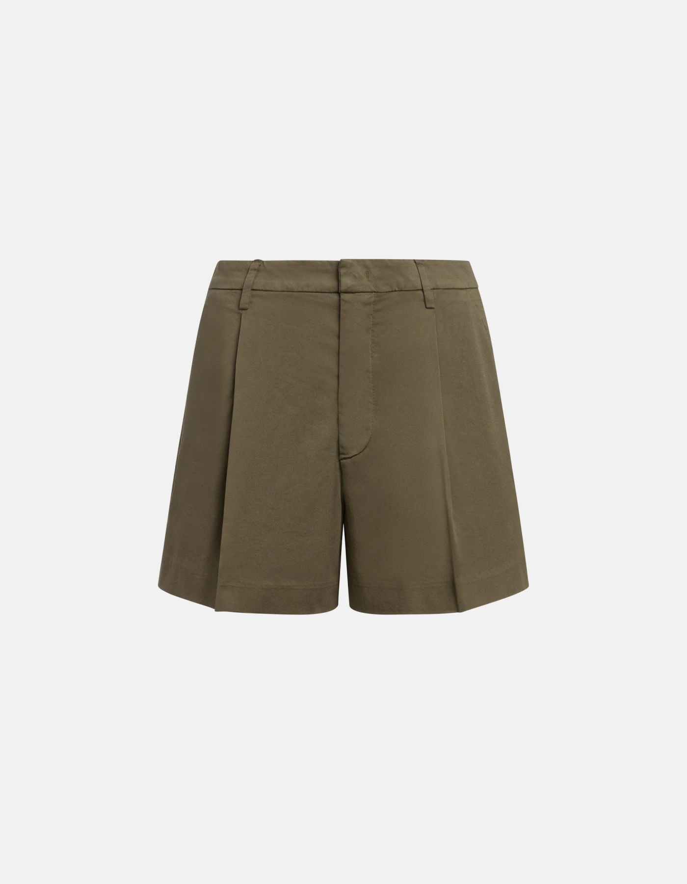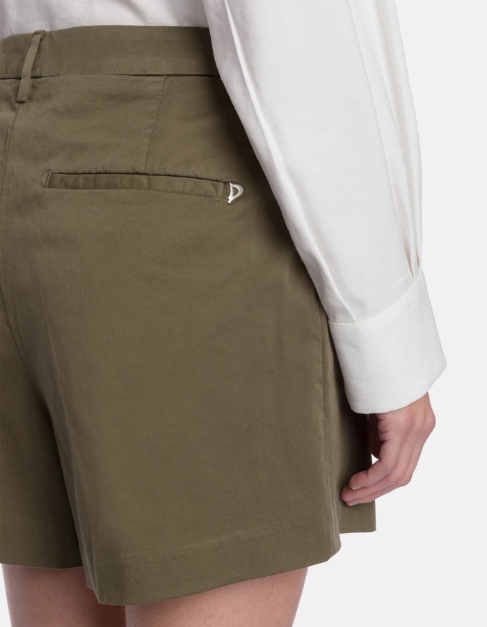 Shorts Lori loose fit, vita alta, pinces sul davanti, tasche a filetto posteriori. Gabardina compact stretch. Tintura in capo. Logo Dondup. Made in Italy