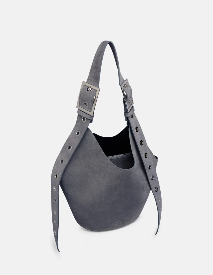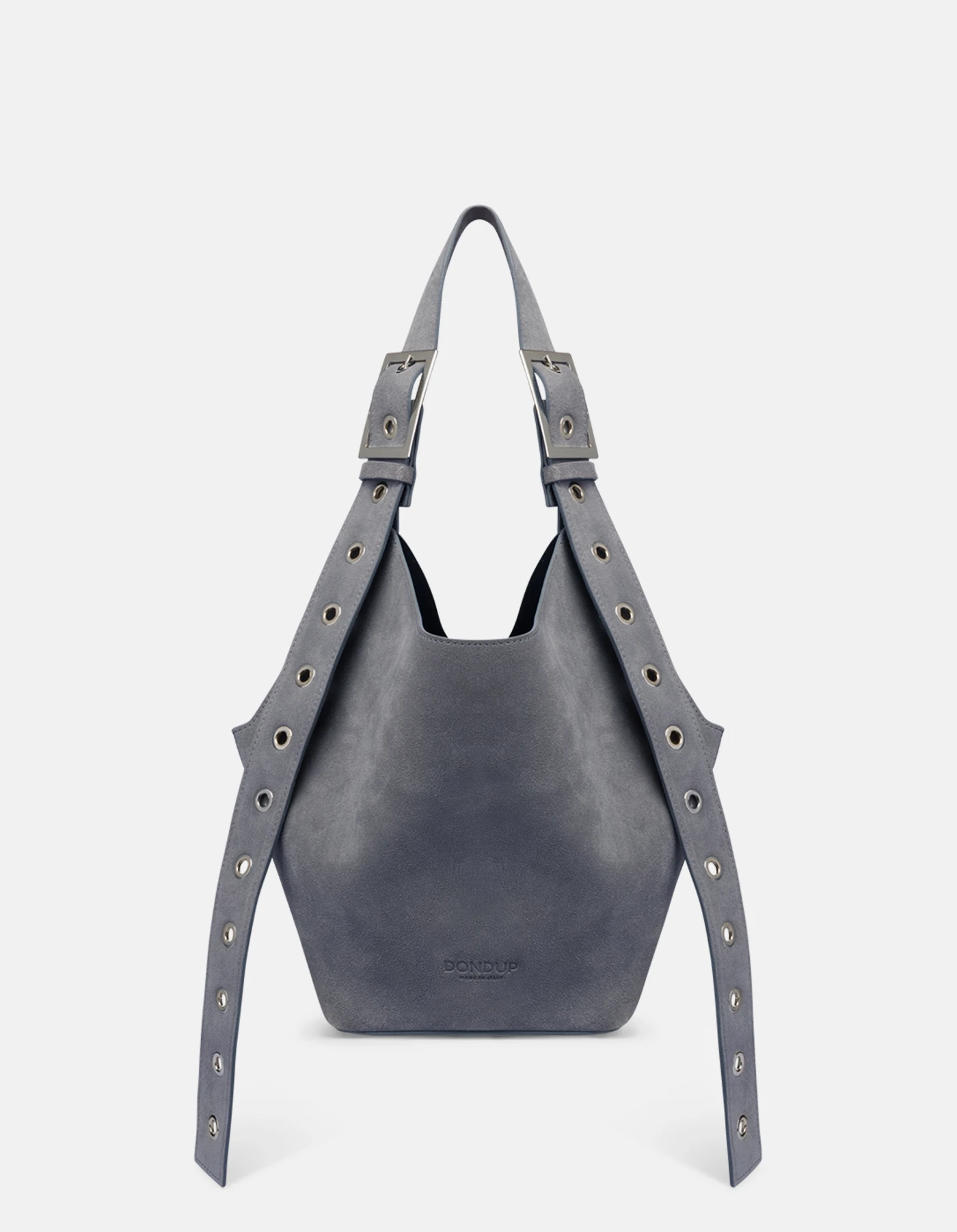 Small hobo con manico singolo regolabile, doppia fibbia logata ed occhielli, logo marchiato a caldo. Clutch interna removibile logata a caldo con chiusura a zip. Crosta. Logo Dondup. Made in Italy
