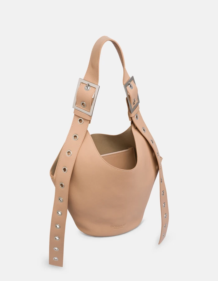 Small hobo con manico singolo regolabile, doppia fibbia logata ed occhielli, logo marchiato a caldo. Clutch interna removibile logata a caldo con chiusura a zip. Pelle. Logo Dondup. Made in Italy