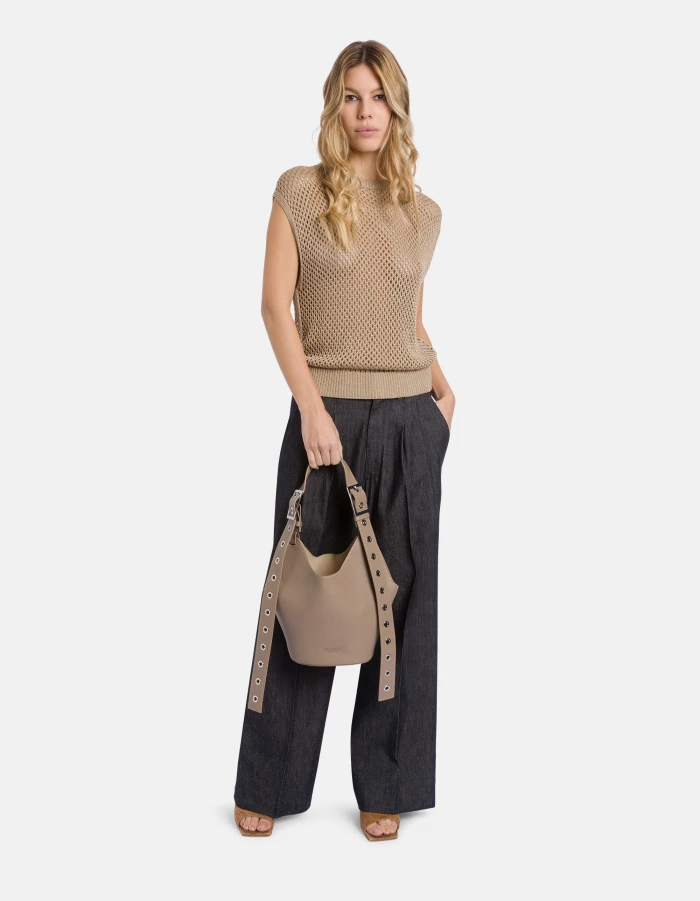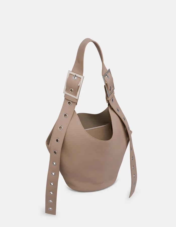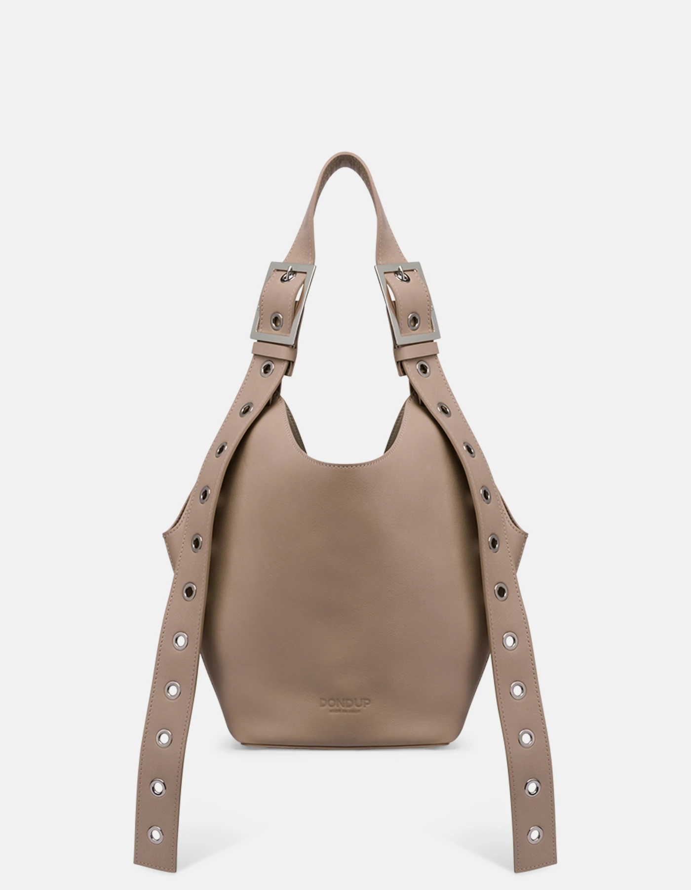 Small hobo con manico singolo regolabile, doppia fibbia logata ed occhielli, logo marchiato a caldo. Clutch interna removibile logata a caldo con chiusura a zip. Pelle. Logo Dondup. Made in Italy