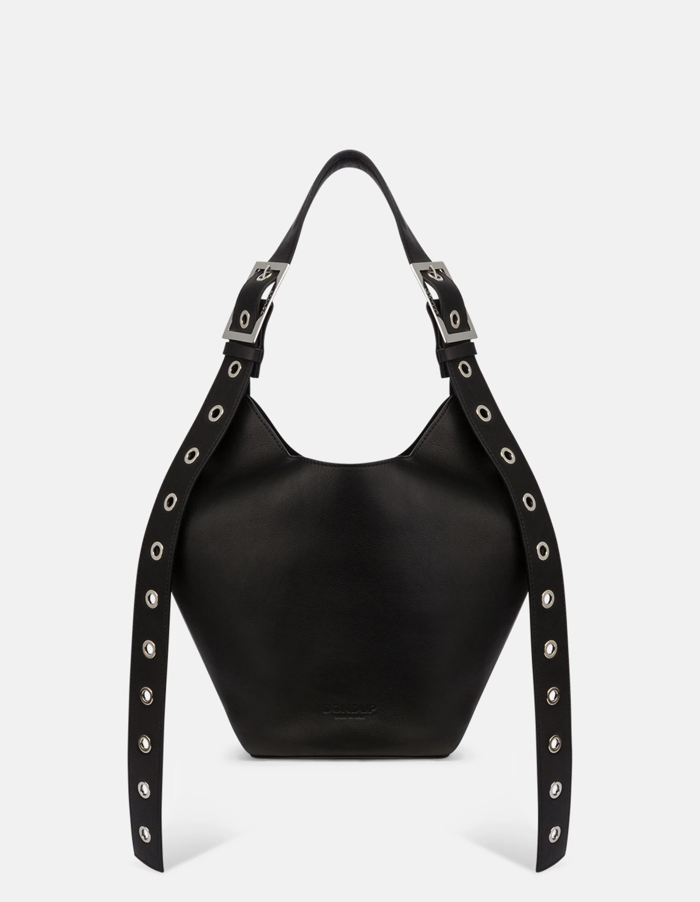 Small hobo con manico singolo regolabile, doppia fibbia logata ed occhielli, logo marchiato a caldo. Clutch interna removibile logata a caldo con chiusura a zip. Pelle. Logo Dondup. Made in Italy