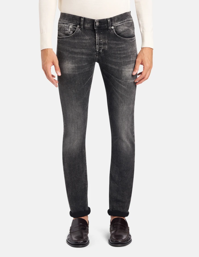 George skinny-fit five-pocket jeans, low waist, welt pocket. Black black 10.50 oz recycled power stretch denim. Black vintage wash. Dondup logo. Made in Italy