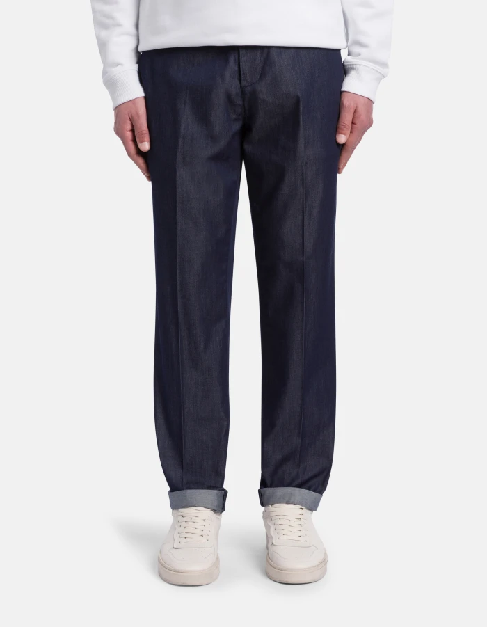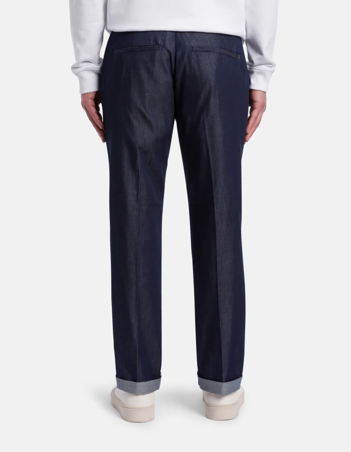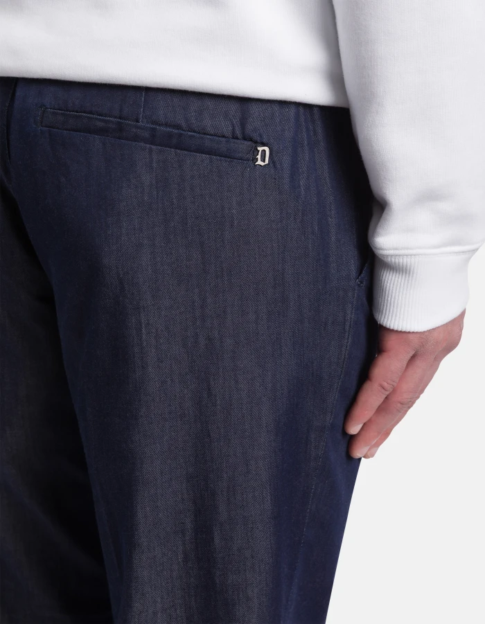 Gaubert relaxed regular-fit chinos, low waist, welt pockets at the back. Bright blue 5.5 oz rigid denim. Clean grey wash. Dondup logo. Made in Italy