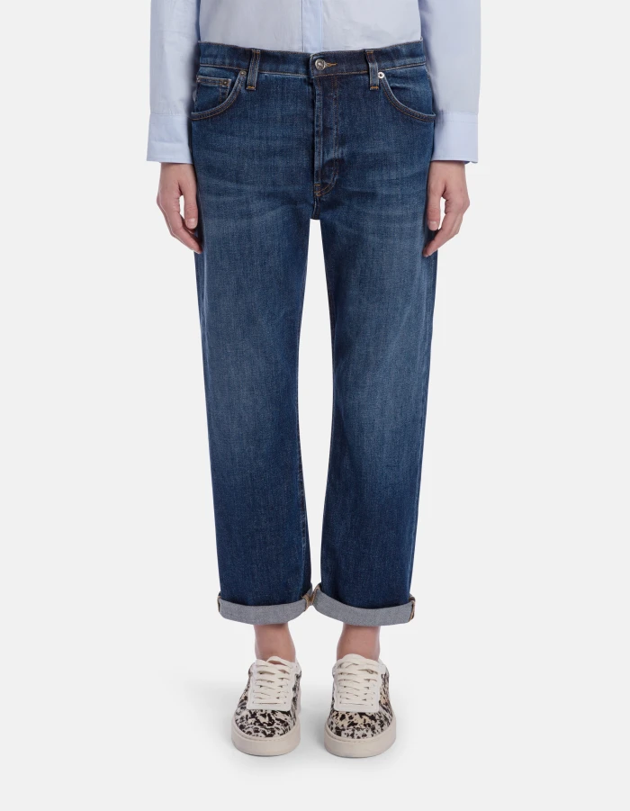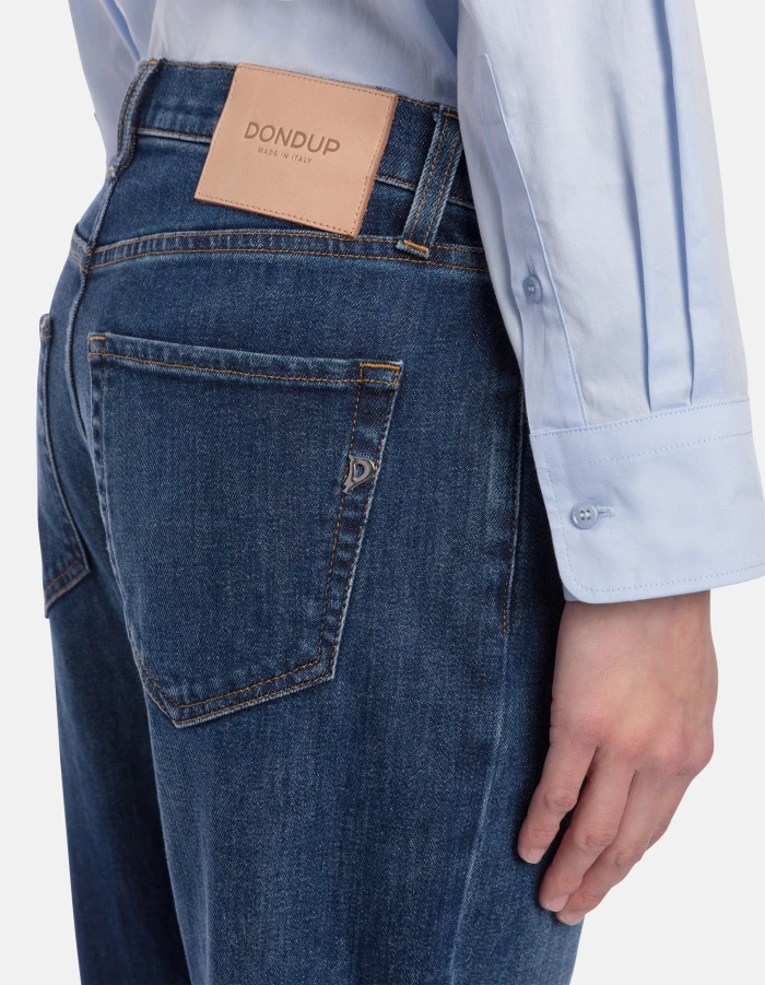 Icon regular-fit 5-pocket jeans, regular waist. Blue 11.5 oz bluesign APPROVED stretch denim. Clean medium wash. Dondup logo. Made in Italy