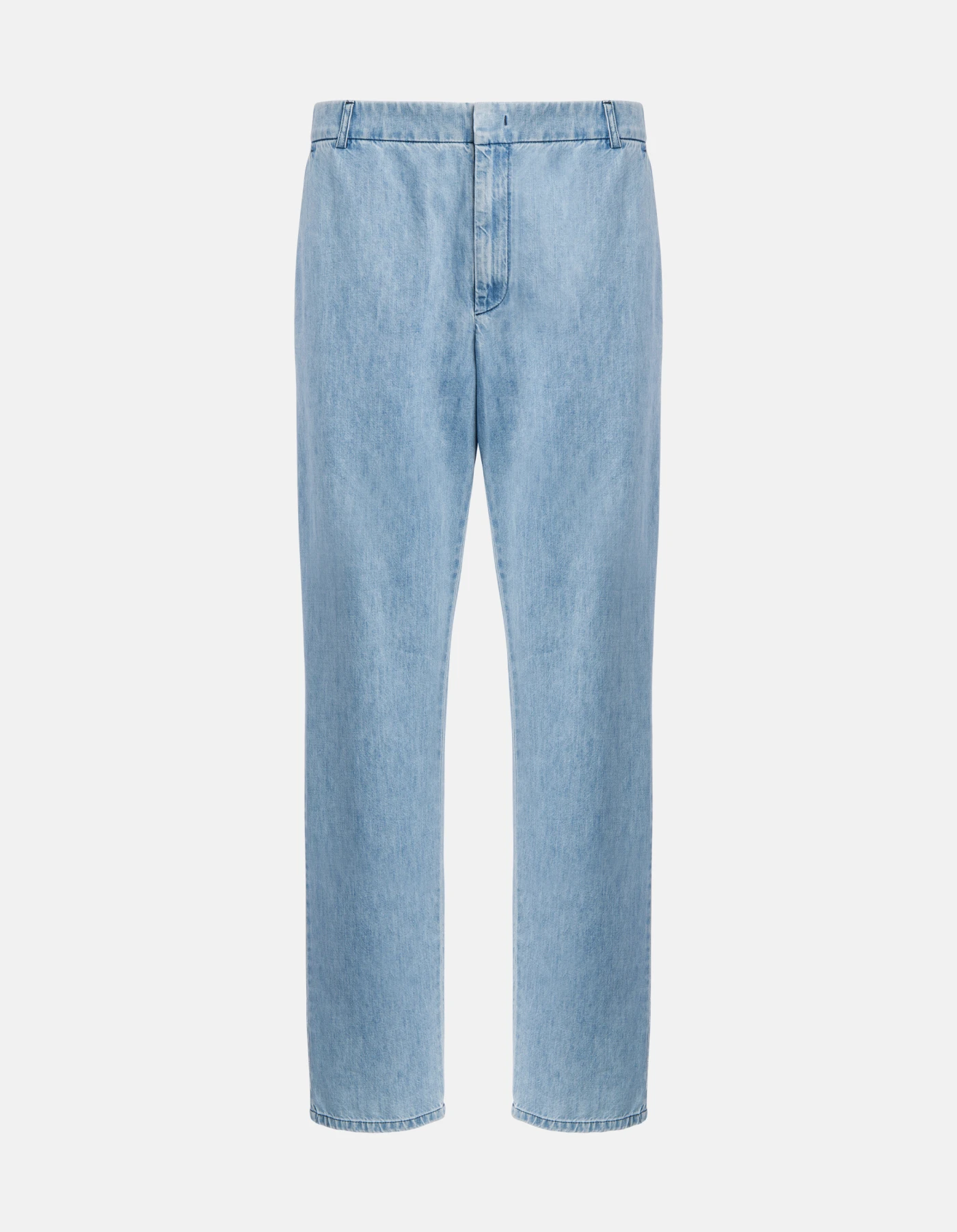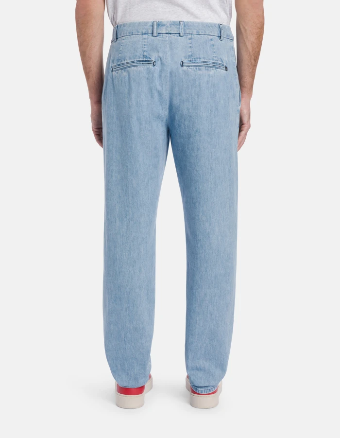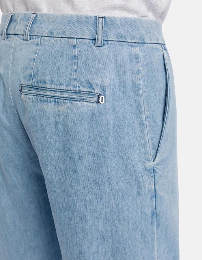 James loose-fit chinos, regular waist, welt pockets at the back. Blue 8.5 oz rigid denim. Light clean wash. Dondup logo. Made in Italy