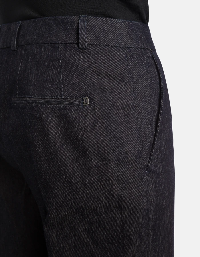 James loose-fit chinos, regular waist, welt pockets at the back. Blue 7 oz rigid silk denim. Clean dark wash. Dondup logo. Made in Italy