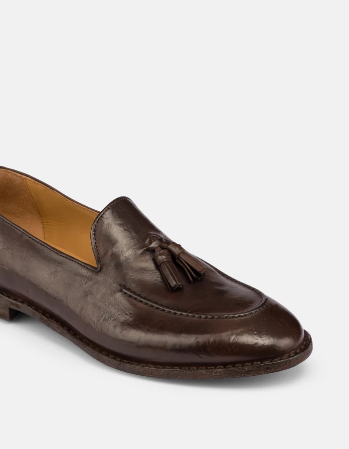 Moccasin with tassels and leather sole. Vintage wash. Leather. Made in Italy