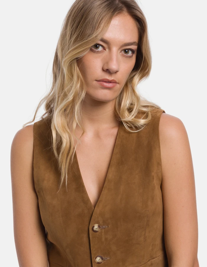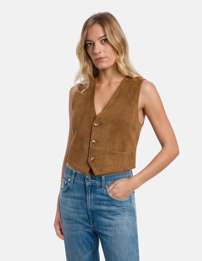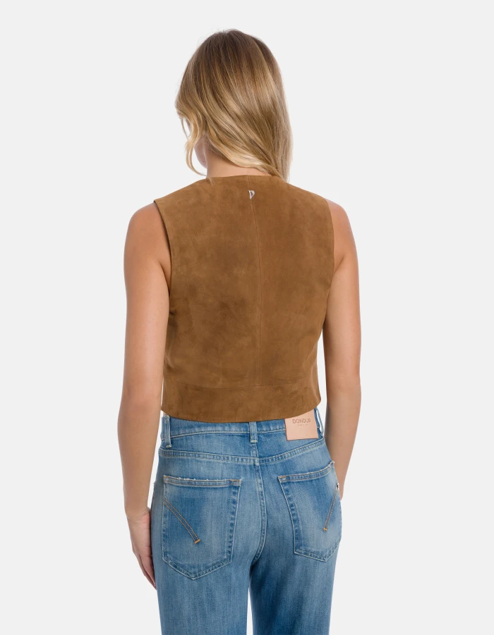 Slim-fit V-neck waistcoat with three buttons, peplum cut and inset pocket. Suede. Dondup logo. Made in Italy