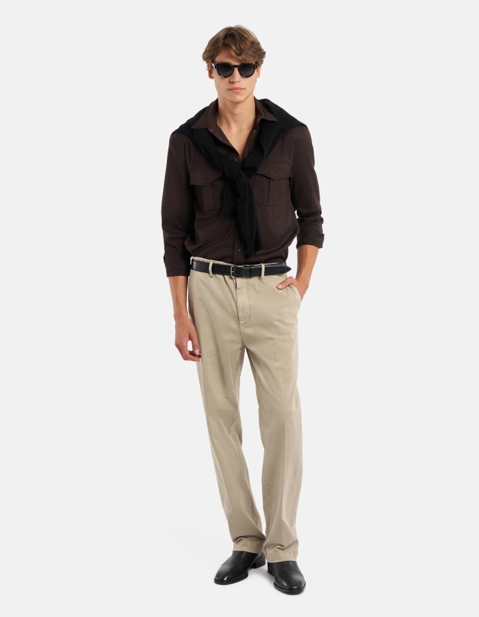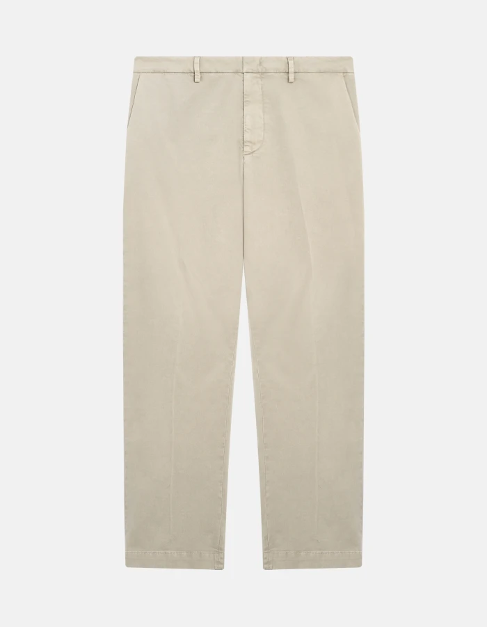 Caleb regular-fit chino trousers, low waist, straight leg and welt pockets at the back. Warm hand stretch gabardine. Vintage garment dye. Dondup logo. Made in Italy