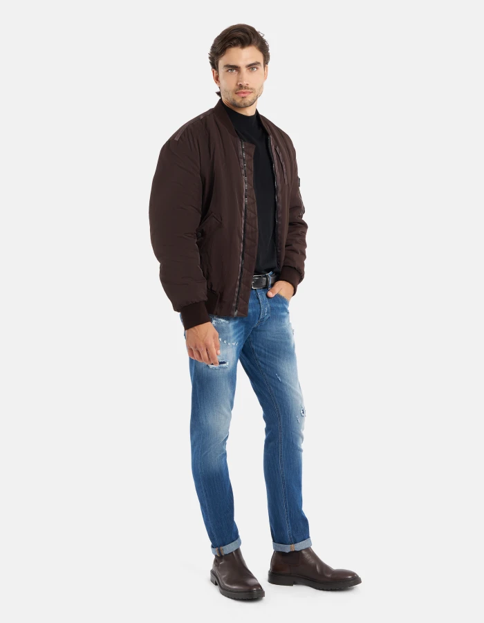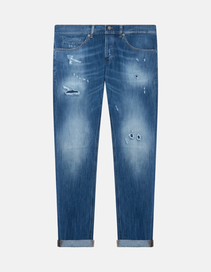 George skinny-fit five-pocket jeans, low waist, welt pocket. Blue 11 oz stretch denim. Medium wash with rips and repairs. Dondup logo. Made in Italy