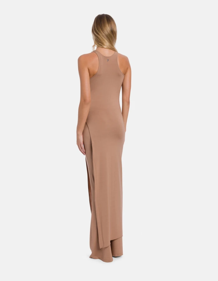 Long, sleeveless dress with deep side slit. Viscose jersey. Dondup logo. Made in Italy