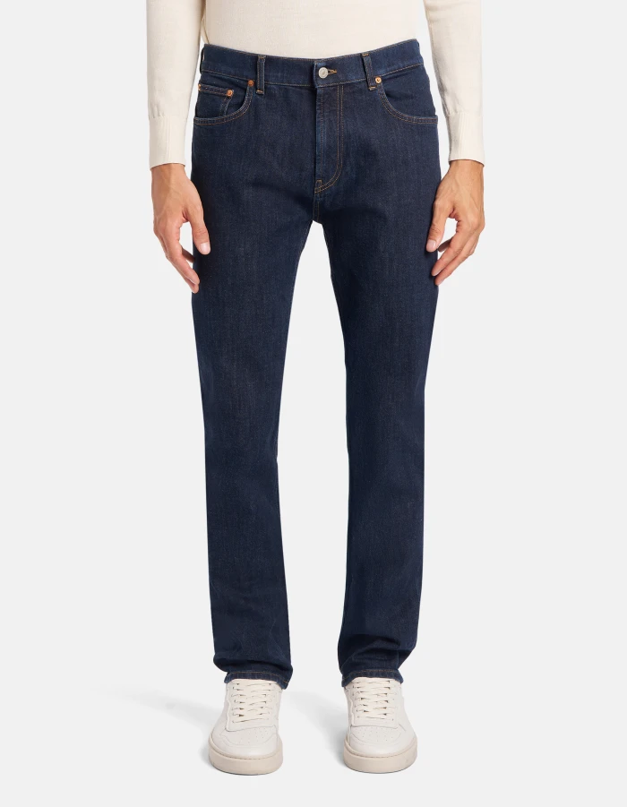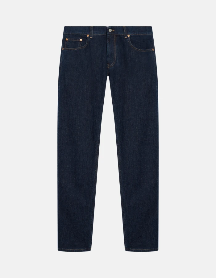 Andi loose-fit five-pocket jeans, regular waist. Blue 11 1/2 oz stretch denim. Clean dark wash. Dondup logo. Made in Italy