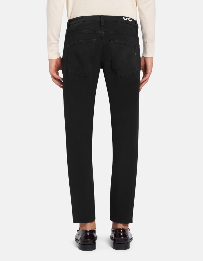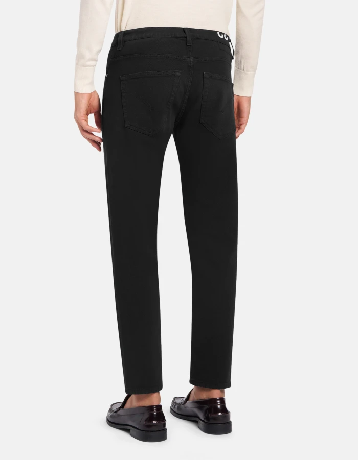 Brighton carrot-fit five-pocket jeans, low waist. Blue 11 1/2 oz bluesign APPROVED stretch bull denim. Bluesign garment dyed. Dondup logo. Made in Italy