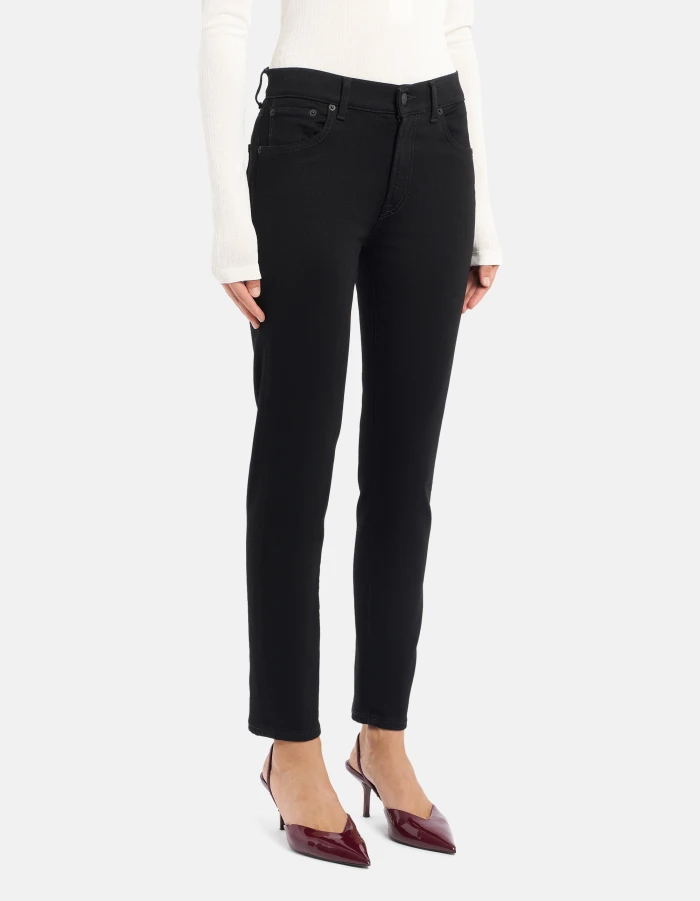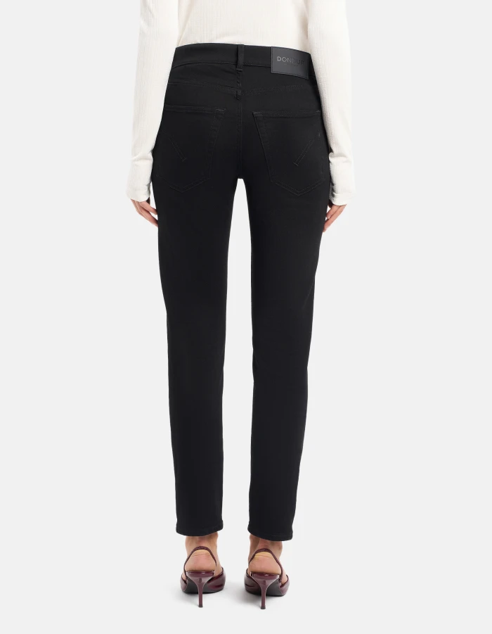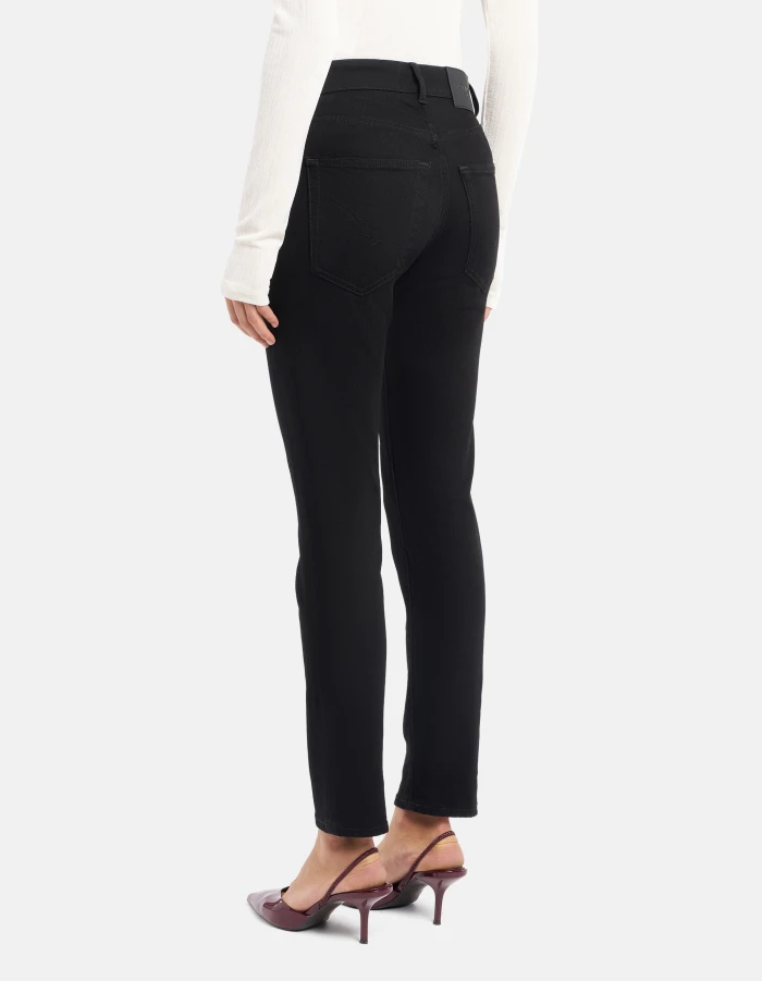 Daila slim-fit five-pocket jeans, regular waist, straight leg. Black black 10 oz recycled stretch denim. GRS clean black wash. Dondup logo. Made in Italy