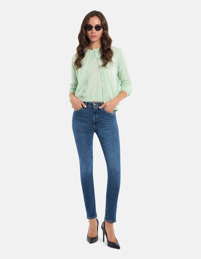 Iris super skinny five-pocket jeans, high waist, ankle length. Blue 13 1/4 oz sustainable stretch denim. Dark clean GOTS wash. Dondup logo. Made in Italy