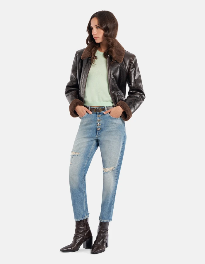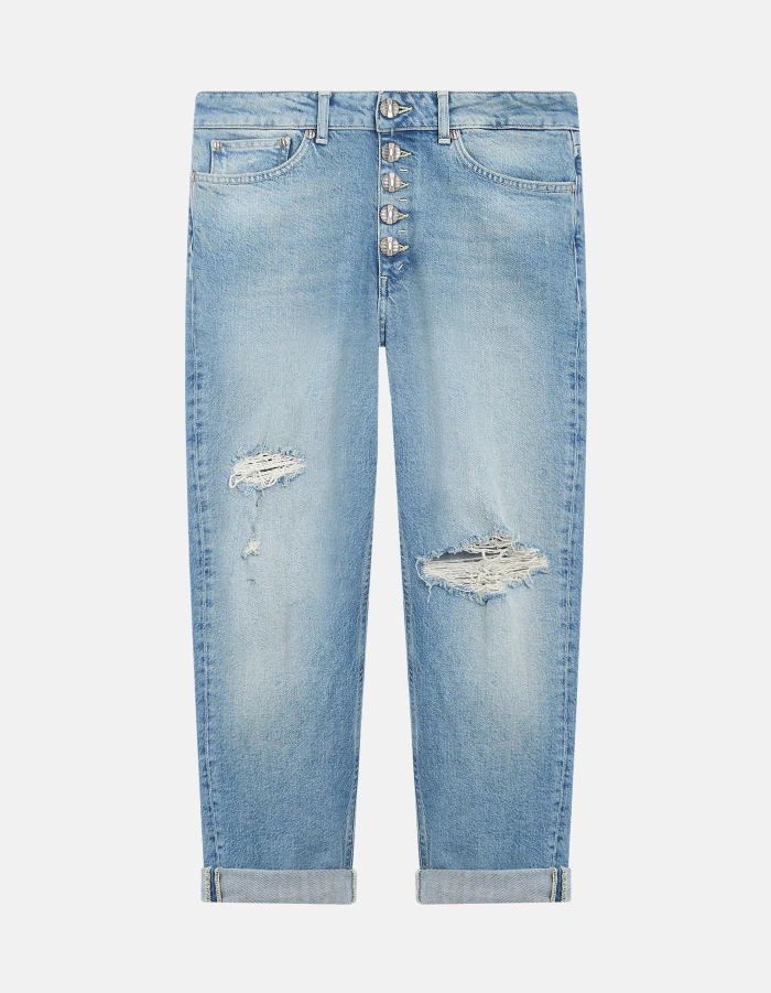 Koons loose-fit five-pocket jeans, regular waist, jewel button panel, ankle length. Blue 14 oz stretch denim. Light vintage wash with repairs. Dondup logo. Made in Italy