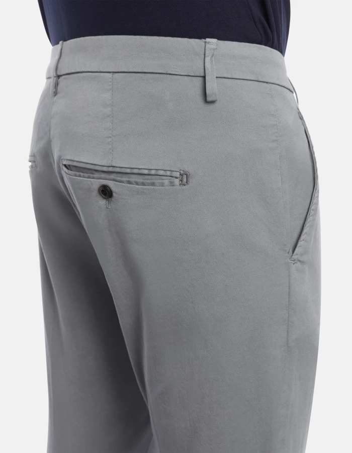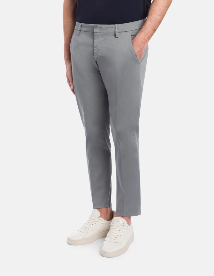 Alfredo slim-fit chinos, low waist, welt pockets at the back, length 28 inches. Stretch compact gabardine. Garment dyed. Dondup logo. Made in Italy