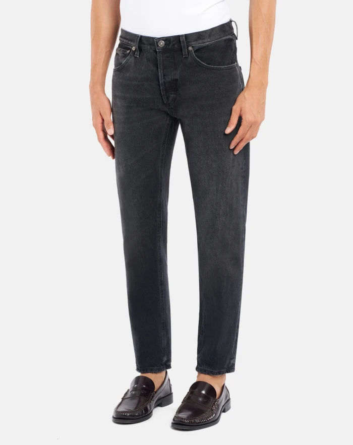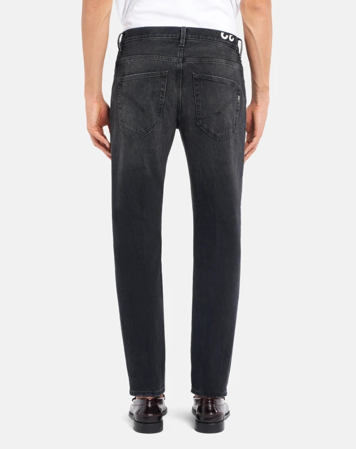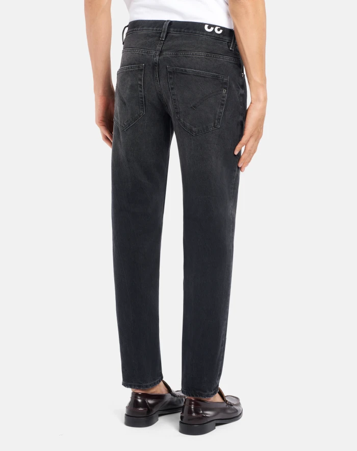 Brighton carrot-fit five-pocket jeans, low waist. Black black 14 oz rigid denim. Vintage clean black wash. Dondup logo. Made in Italy