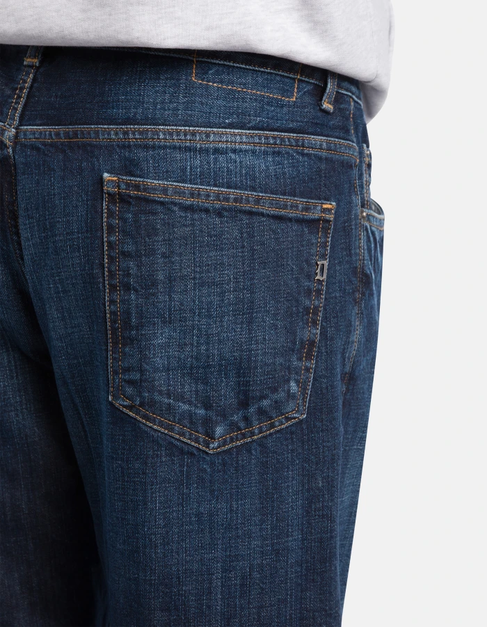 David tapered 5-pocket jeans, low rise, dropped crotch. Blue 12.5 oz rigid cross denim. Vintage dark clean wash. Dondup logo. Made in Italy