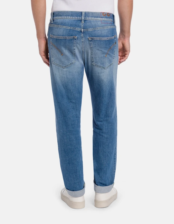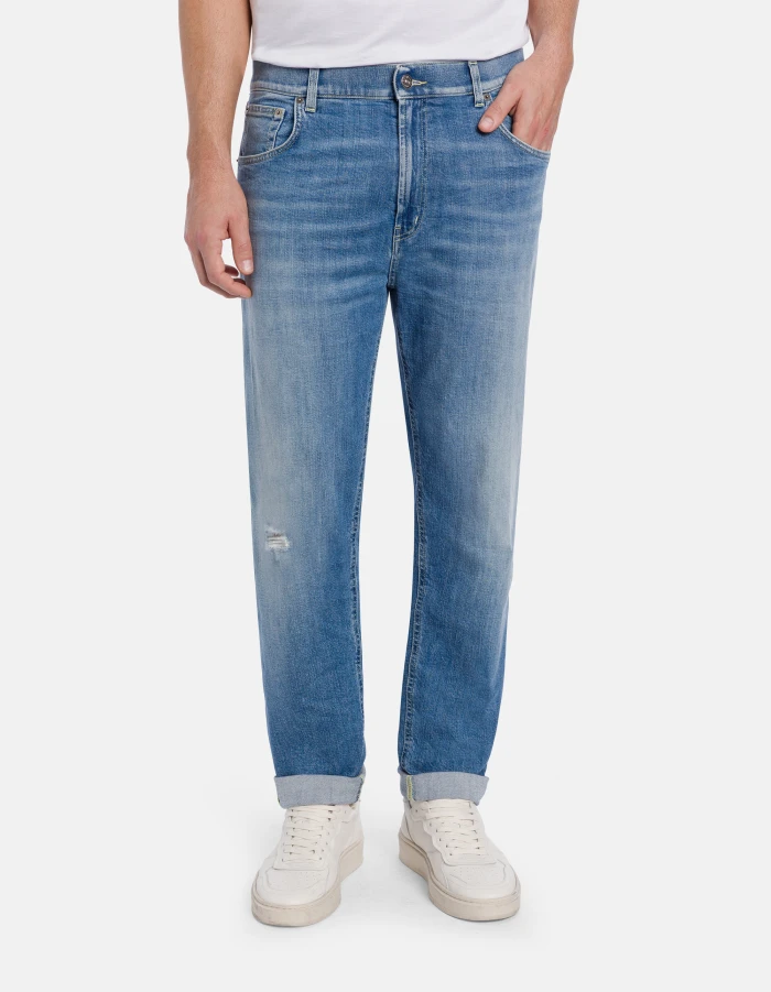 Ervin loose-fit 5-pocket jeans, low rise. Blue 12 oz stretch denim. Medium-light wash with rips. Dondup logo. Made in Italy
