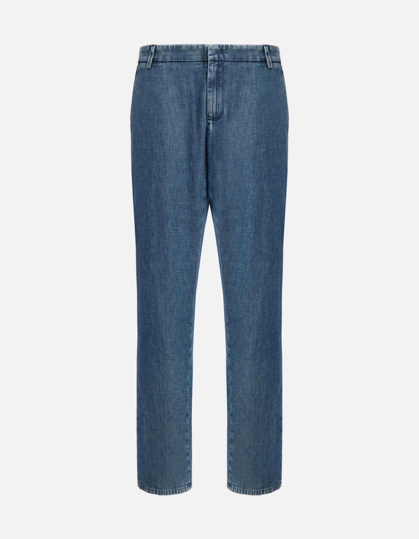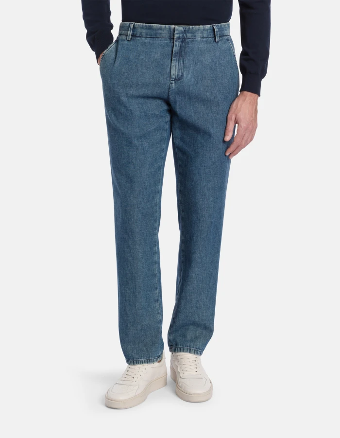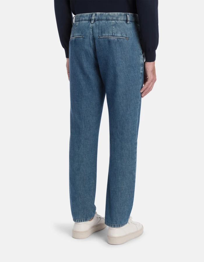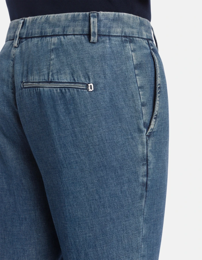 Gaubert relaxed regular-fit chinos, low waist, welt pockets at the back. Blue 7.75 oz woven rigid denim. Blue vintage wash. Dondup logo. Made in Italy