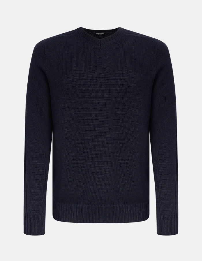 Regular-fit V-neck jumper with long sleeves, fisherman’s rib inserts and D logo applique on the back. Basic wool. Dondup logo. Made in Italy