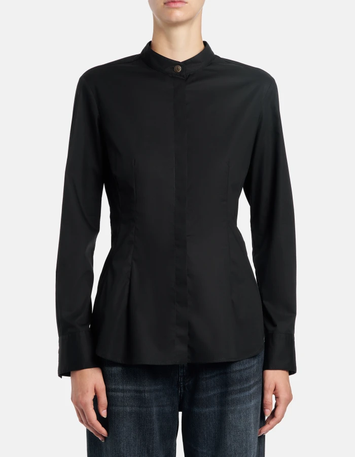 Slim-fit long-sleeved shirt with mandarin collar, concealed buttons, central split at the back and jewel buttons on the collar and cuffs. Stretch poplin. Dondup logo. Made in Italy