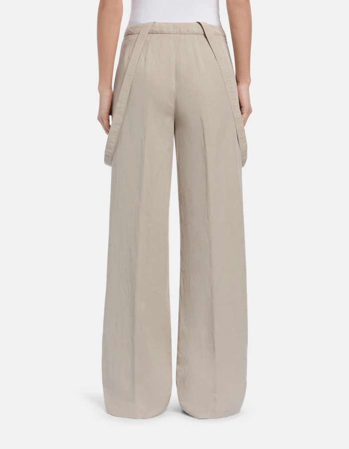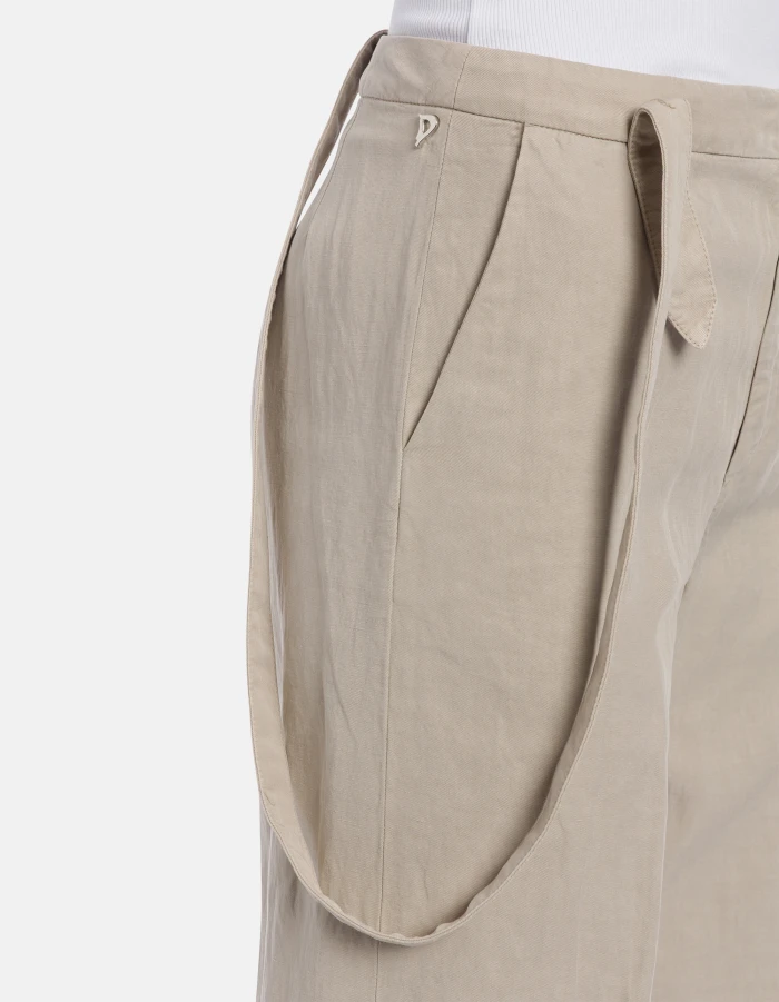 Tecla wide-leg chinos with adjustable waistband and removable braces. Linen and lyocell. Garment-dyed. Dondup logo. Made in Italy