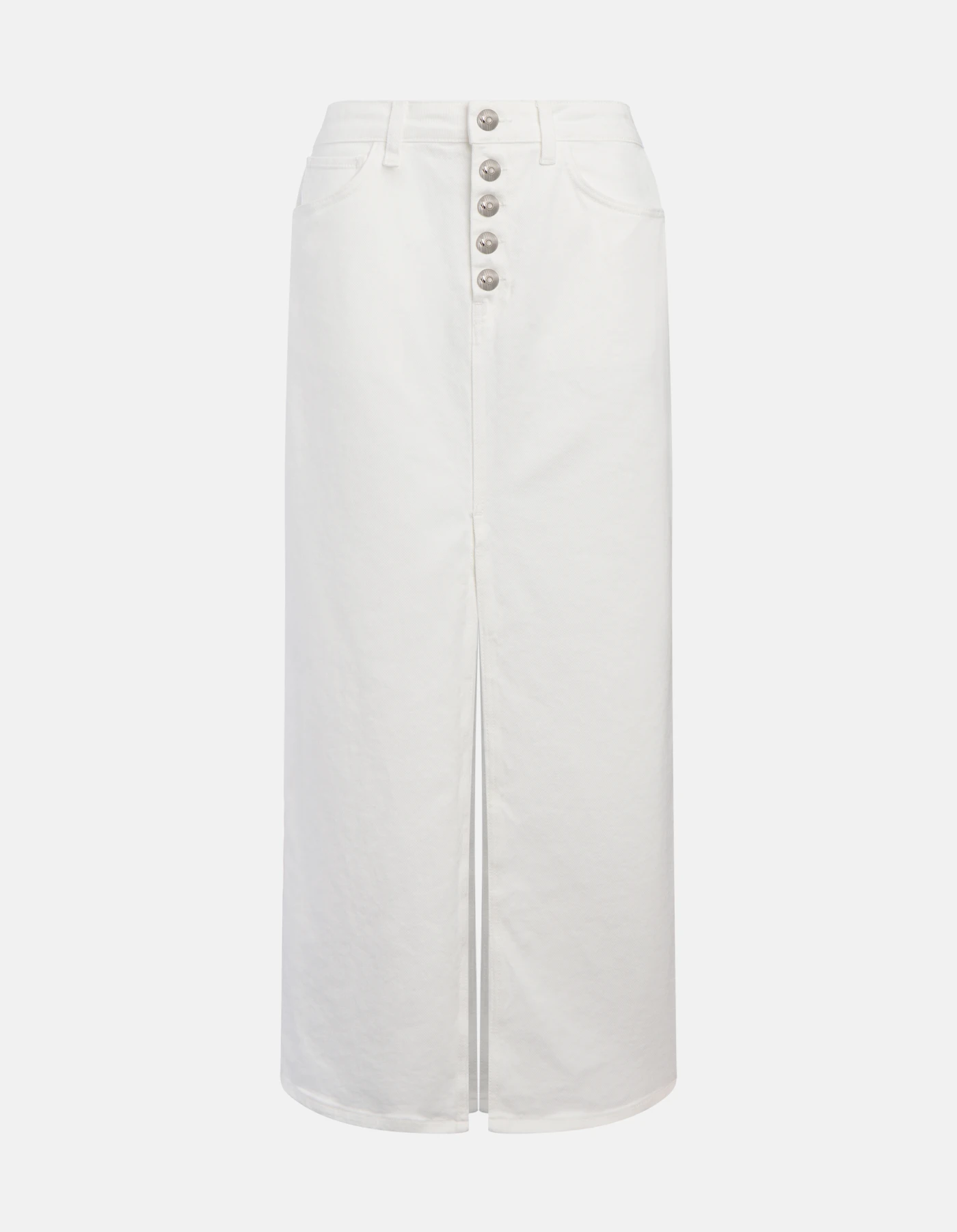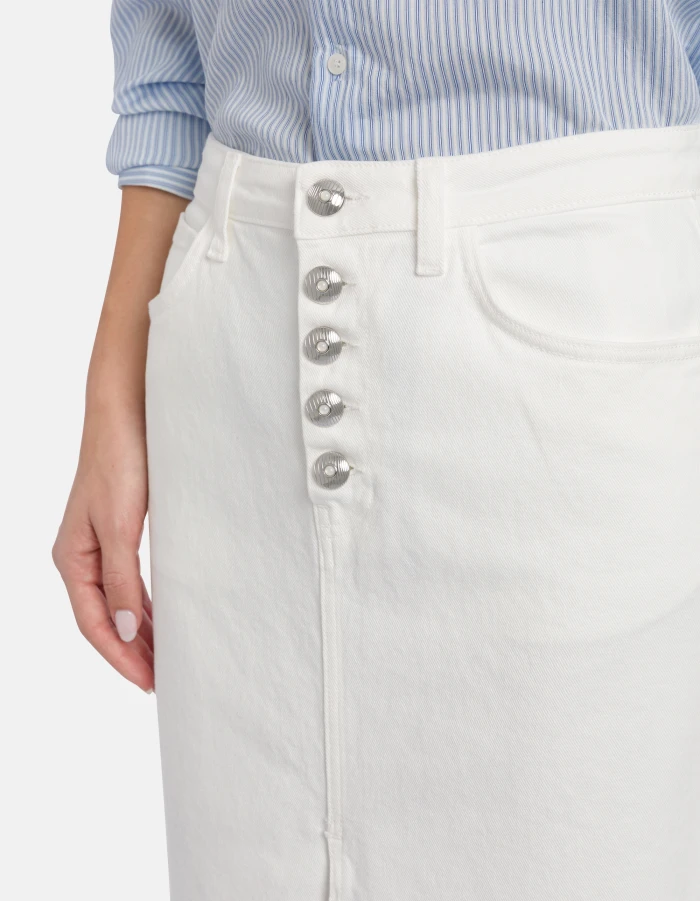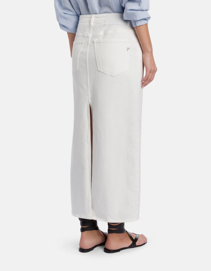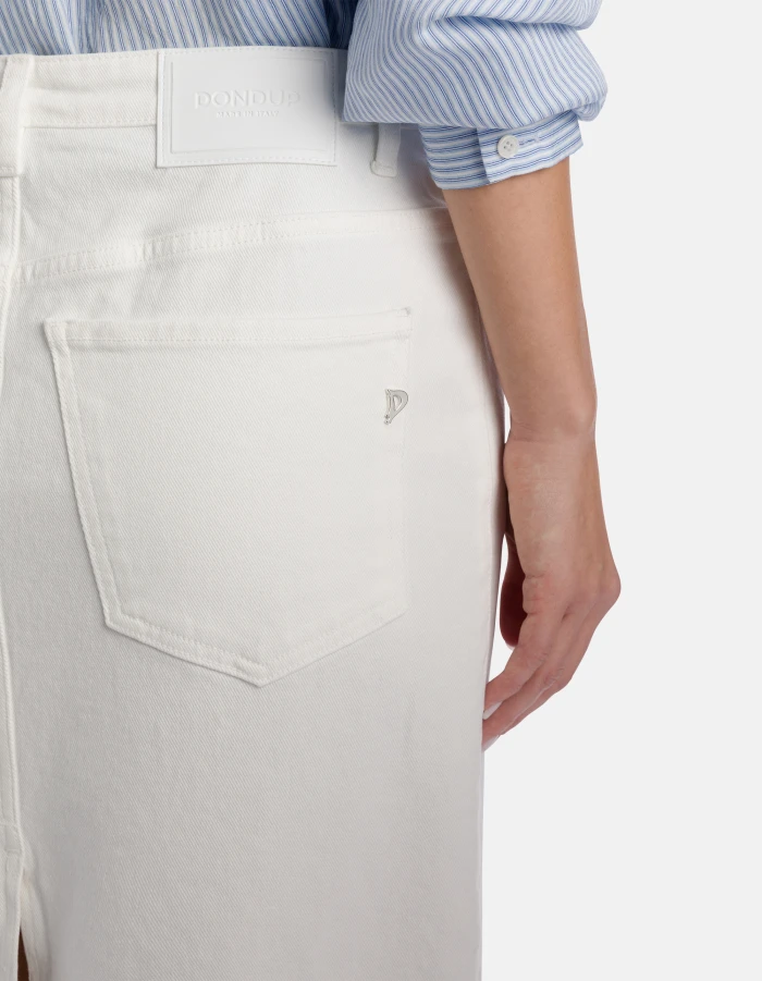 Slim-fit long skirt with jewelled button panel and deep centre slits at front and back. 11.5 oz bluesign APPROVED stretch bull denim. Bluesign garment-dyed. Dondup logo. Made in Italy