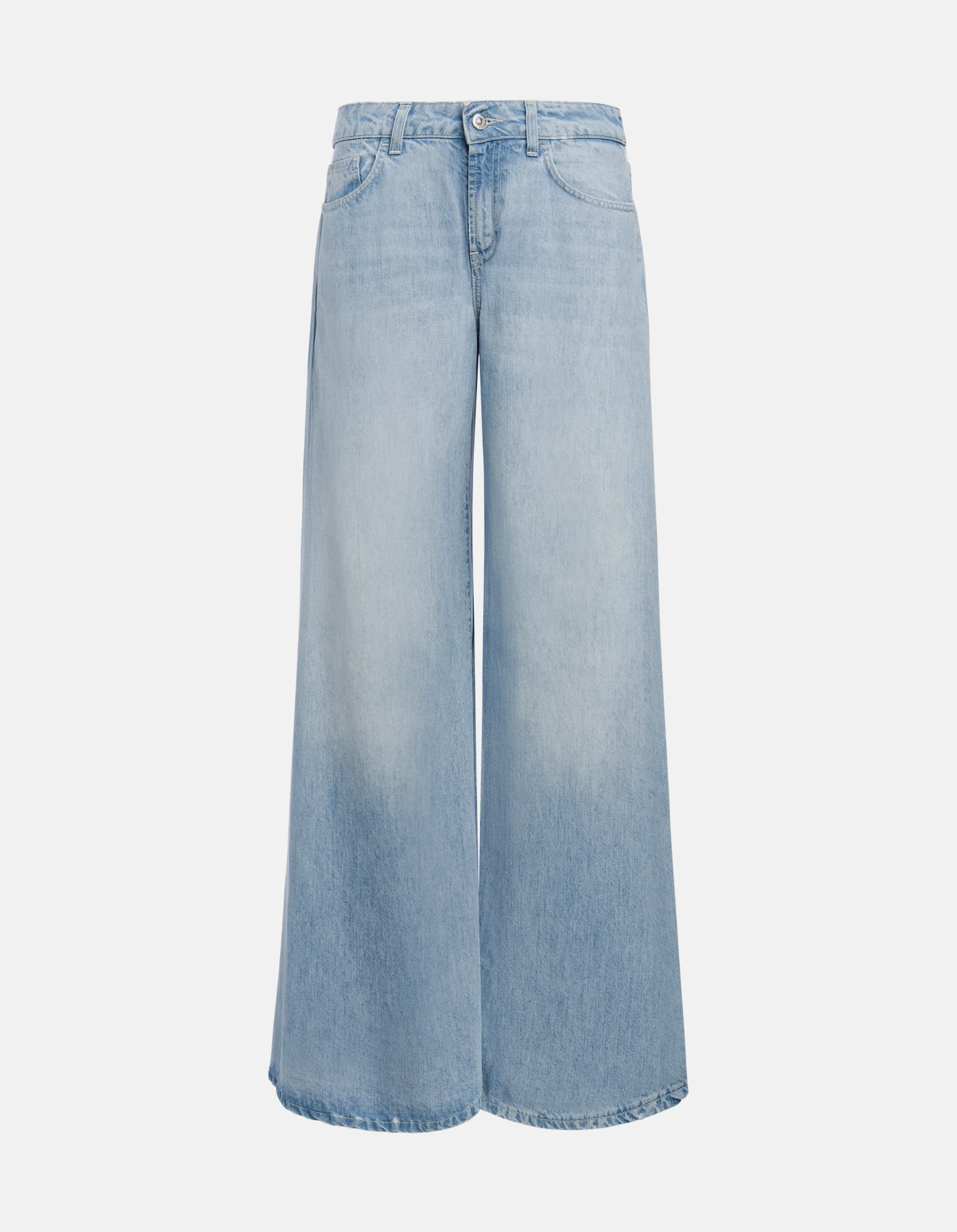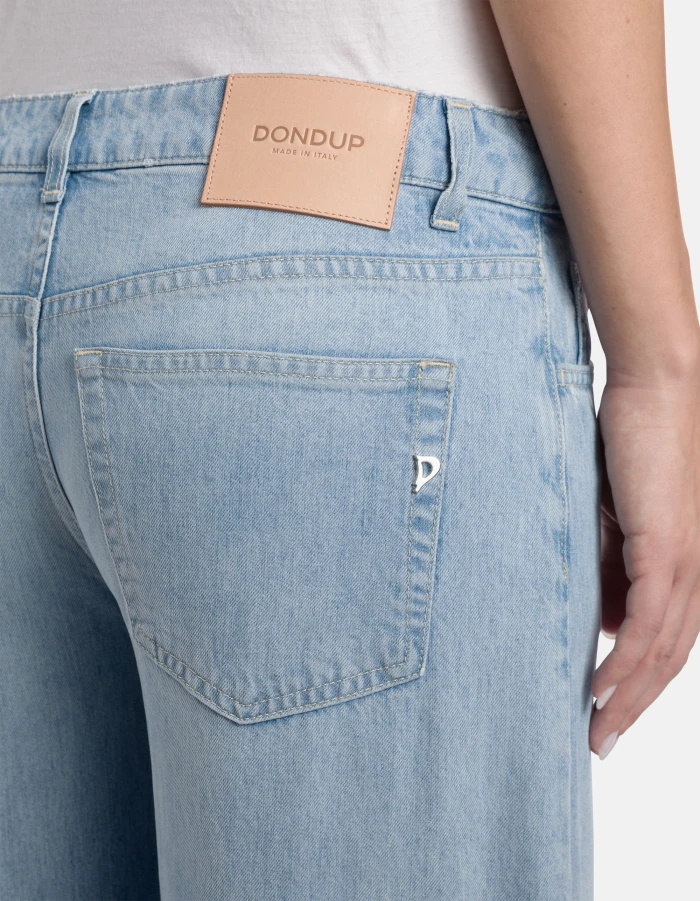 Marlen very wide leg 5-pocket jeans, regular waist. 9 oz blue rigid lyocell denim. Light clean wash. Dondup logo. Made in Italy