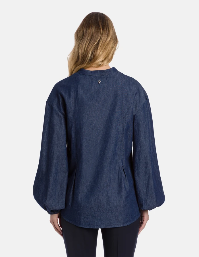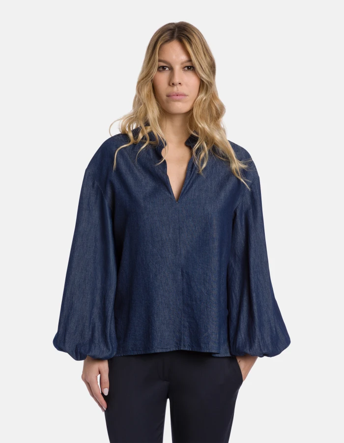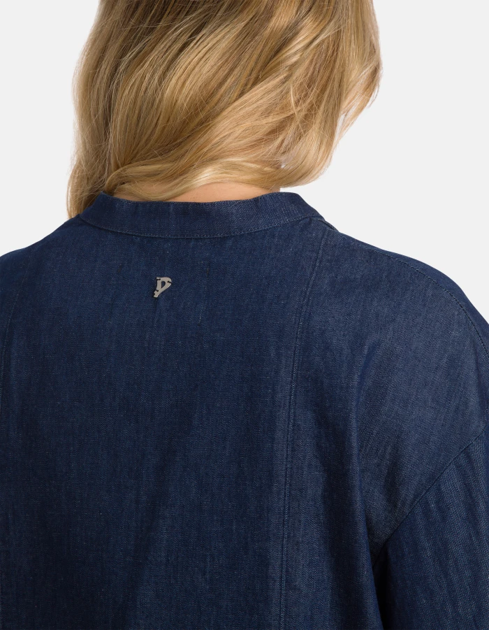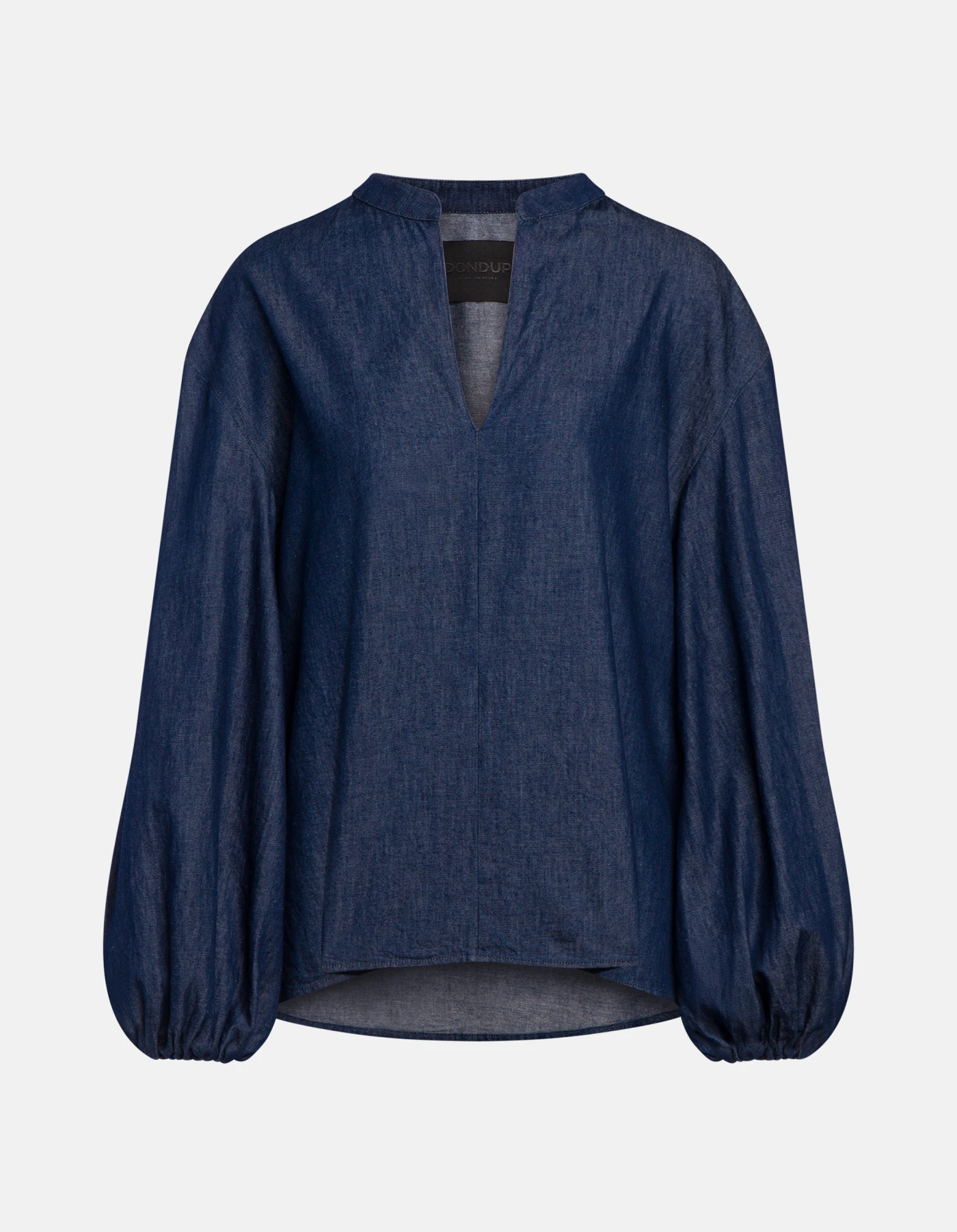 Regular-fit, long-sleeve shirt with ruffled cuffs and a V-neck. Blue 5.5 oz lightweight rigid denim. Soft wash. Dondup logo. Made in Italy