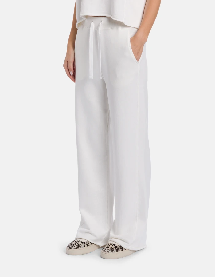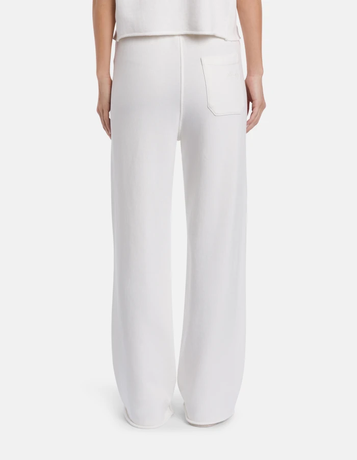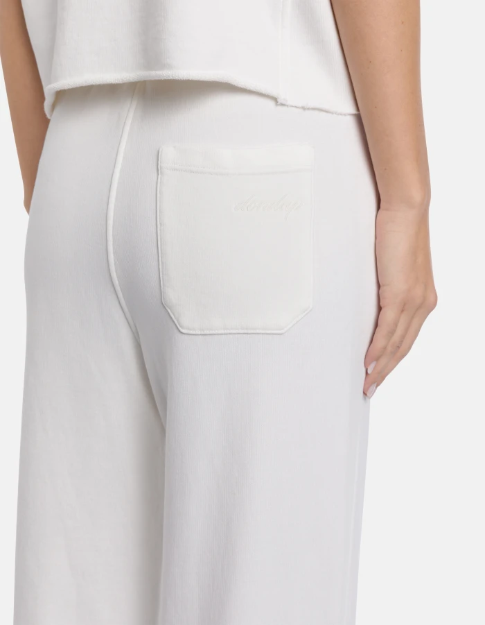 Wide-leg trousers, regular waist with drawstring, back patch pocket, side ribbed insert and embroidered logo. Brushed fleece. Dondup logo. Made in Italy